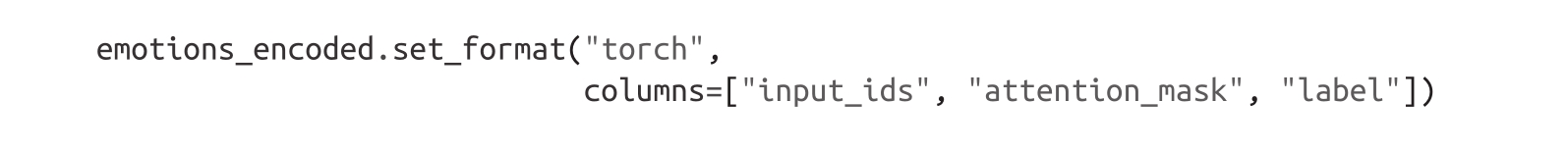 由于我们的模型期望输入张量,下一步需要将input_ids和attention_mask列转换为torch格式,具体如下: