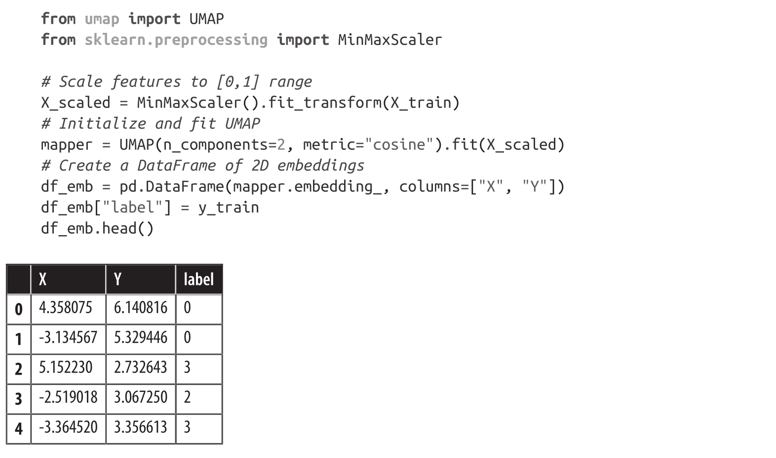 由于在768维度中可视化隐藏状态是个艰难的任务,因此我们将使用强大的UMAP算法将向量投影到2D平面上 [7] 。由于UMAP在特征缩放到[0,1]区间内时效果最佳,因此我们将首先应用一个MinMaxScaler,然后使用umap-learn库的UMAP实现来缩放隐藏状态: