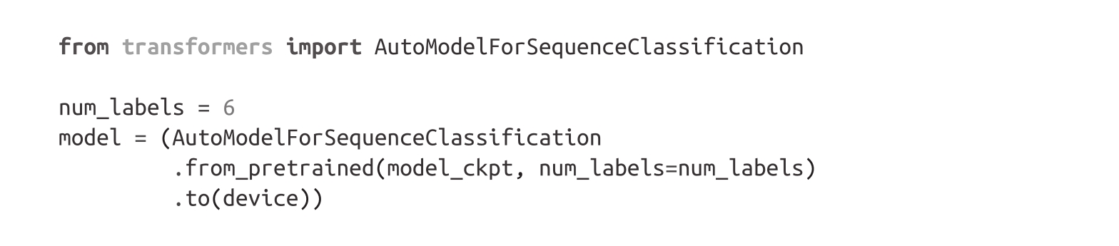 我们要做的第一件事是使用我们在基于特征的方法中一样的DistilBERT预训练模型。唯一的细微修改是我们使用AutoModelForSequenceClassification模型而不是AutoModel。区别在于AutoModelForSequenceClassification模型在预训练模型输出的顶部有一个分类头,可以很容易地与基础模型一起训练。我们只需要指定模型需要预测的标注数量(在我们的情况下为6个),因为这决定了分类头输出的数量: