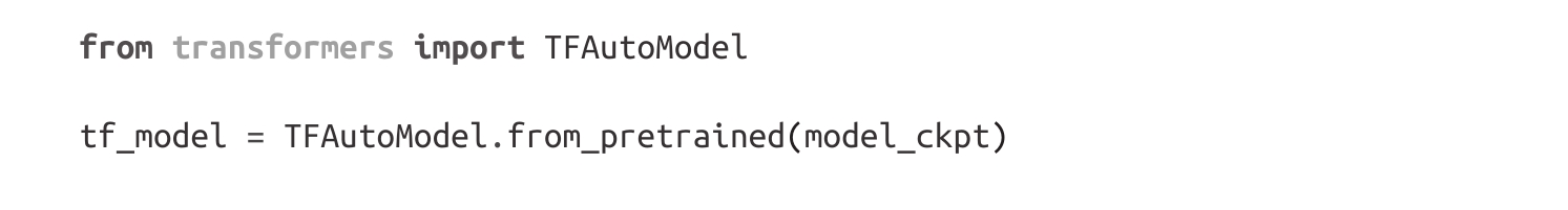 你可以看到,在Hugging Face Transformers库中切换框架非常简单!在大多数情况下,你只需要在类名前添加TF前缀即可获得相应的TensorFlow2.0类。同理,如果要加载PyTorch的权重,你只需要将tf替换成pt字符串即可(例如在接下来的部分中),pt是PyTorch的简称,就像tf代表TensorFlow一样。