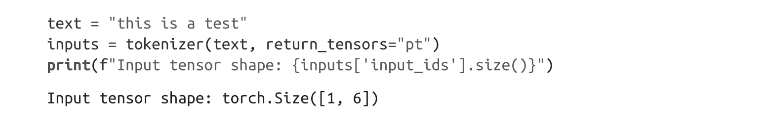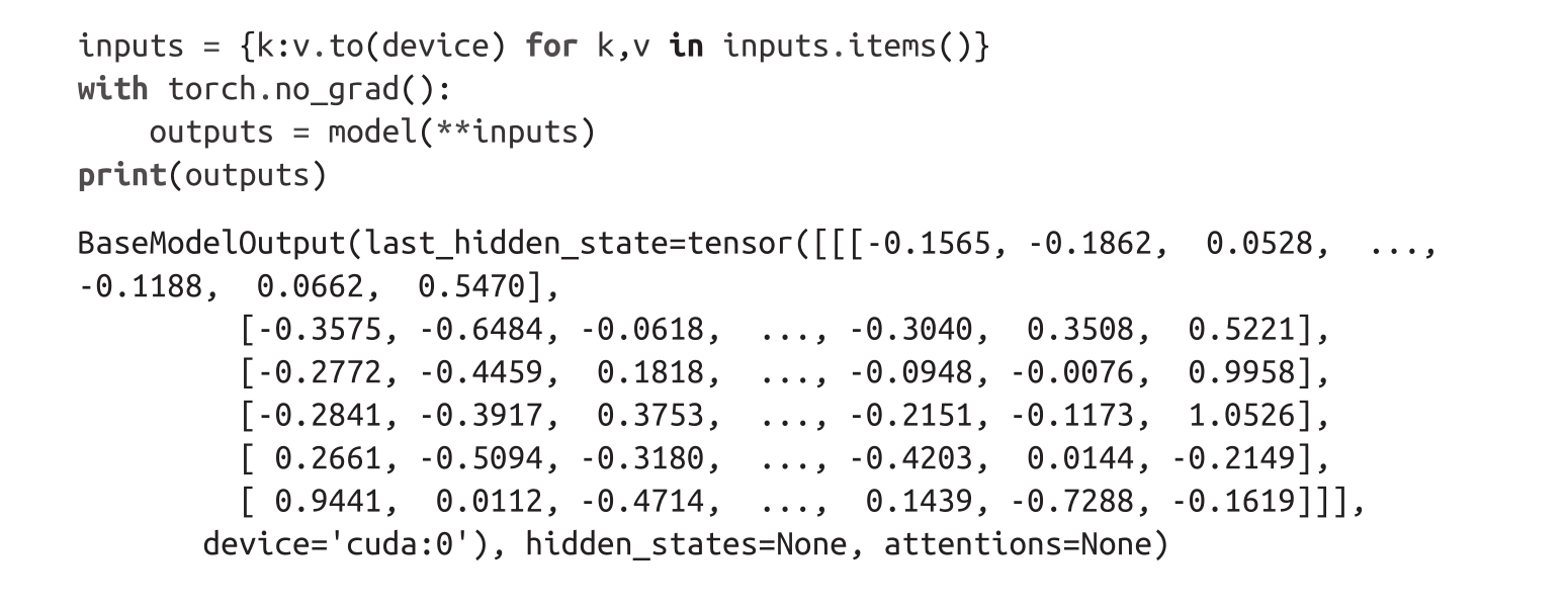 我们可以看到,生成的张量形状为[batch size,n_tokens]。现在我们已经将编码作为张量获取,最后一步是将它们放置在与模型相同的设备上,并按以下方式传输入: