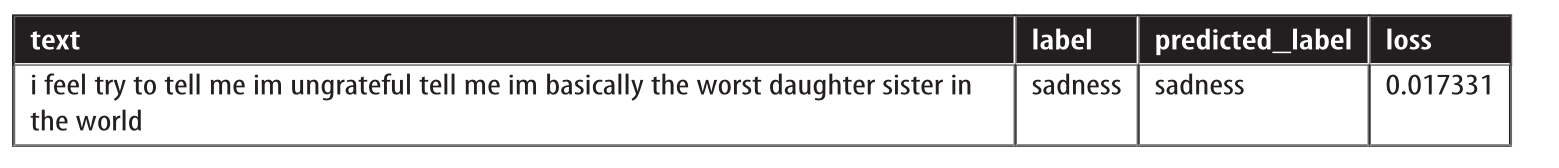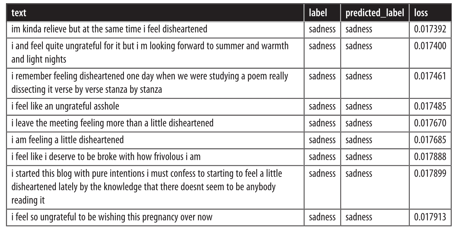 当查看具有最低损失的样本时,我们观察到模型在预测sadness类时最有信心。深度学习模型非常擅长找到和利用短路来进行预测。因此,值得花时间查看模型最有信心的样本,以便我们可以确信模型不会错误地利用文本的某些特征。所以,让我们也看一下损失最小的预测: