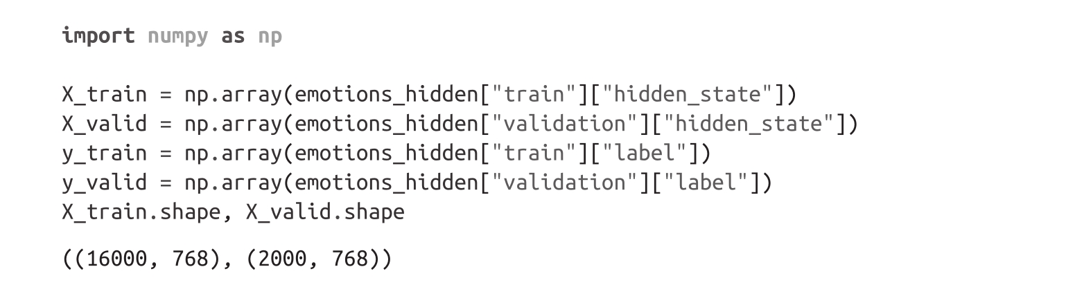 现在我们已经得到了与每个推文相关联的隐藏状态,下一步是基于它们训练一个分类器。为了做到这一点,我们需要一个特征矩阵,我们来看一下。