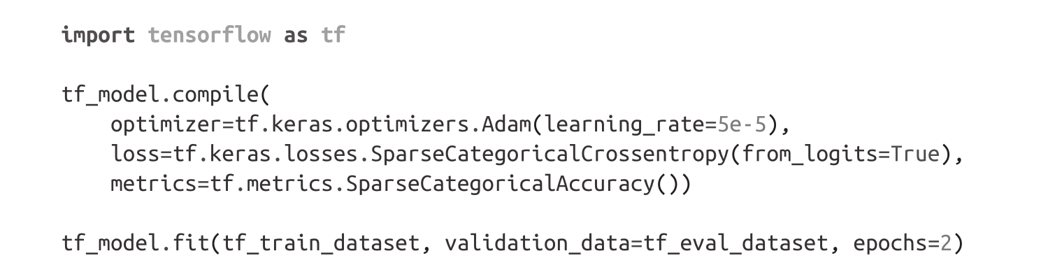 如果你使用的是TensorFlow,那么还可以使用Keras API微调模型。其与PyTorch API的主要区别在于,没有Trainer类,因为Keras模型已经提供了内置的fit()方法。为了了解具体是如何工作的,这里我们将加载DistilBERT模型的TensorFlow版本: