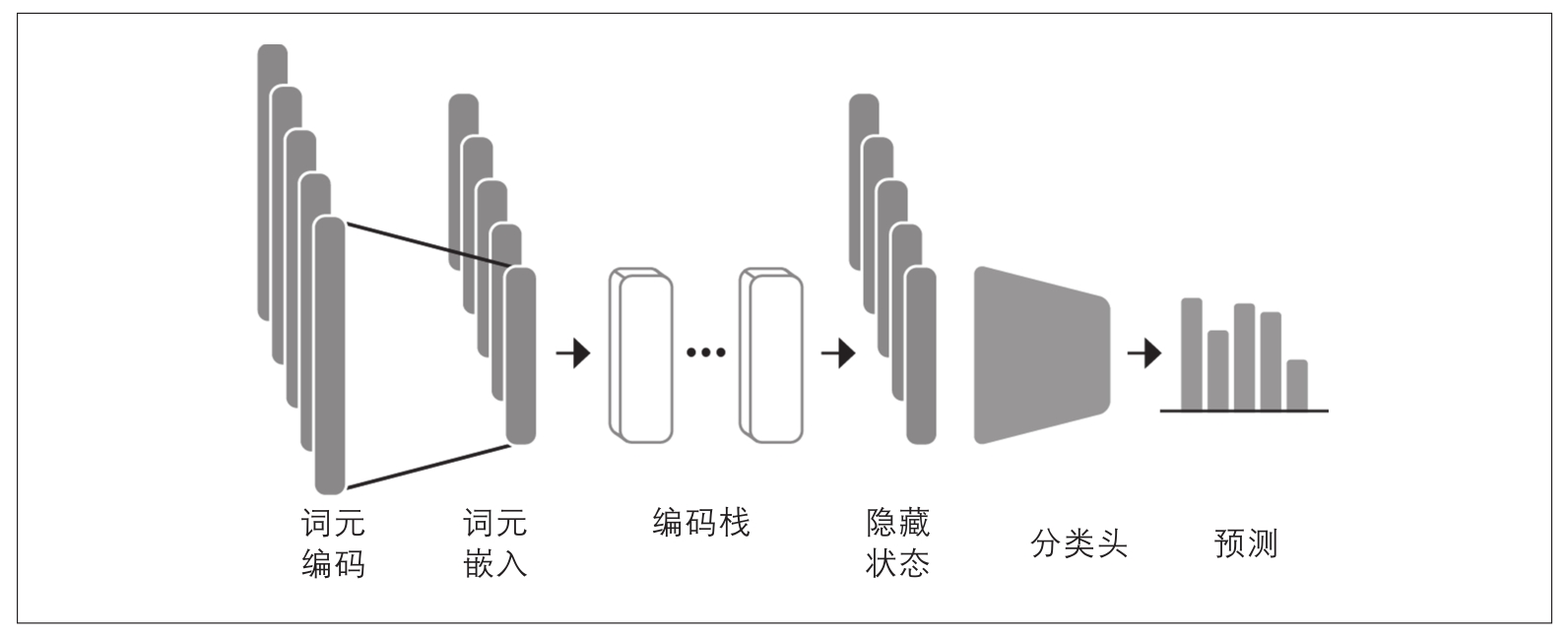 图2-4:使用基于编码器的Transformer进行序列分类的架构。它由模型的预训练主体和自定义分类头组合而成