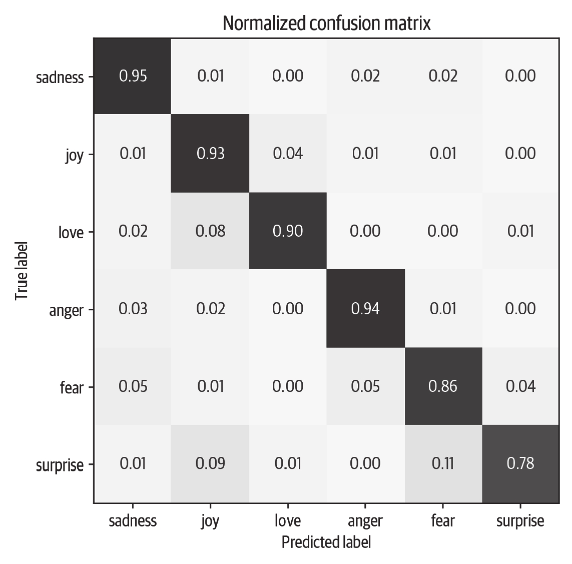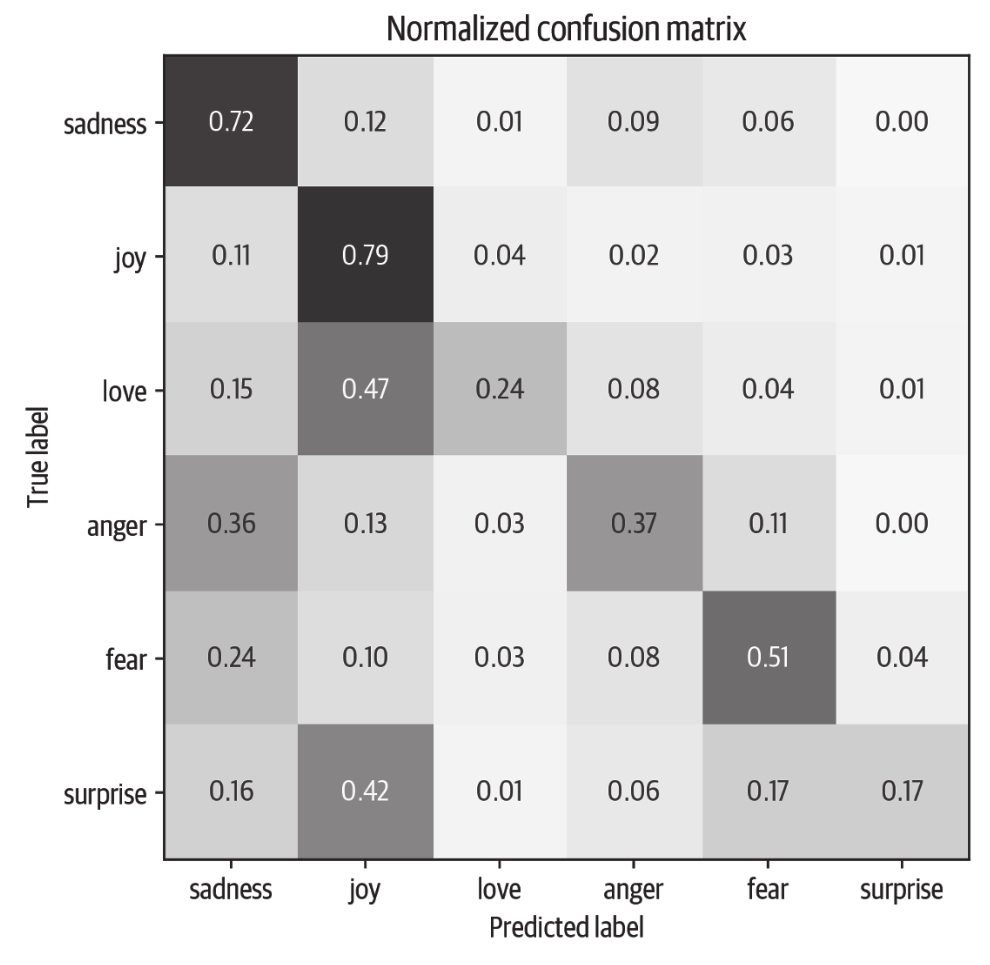 这里我们可以看到,anger和fear最常与sadness混淆,这与我们可视化嵌入时所观察到的一致。此外,love和surprise经常与joy混淆。