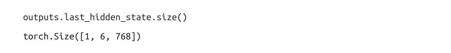 这里我们使用了torch.no_grad()上下文管理器来禁用梯度的自动计算。这对推理很有用,因为它减少了计算的内存占用。根据模型配置,输出可以包含多个对象,例如隐藏状态、损失或注意力,这些对象以类似于Python中的namedtuple的形式排列。在我们的示例中,模型输出是一个BaseModelOutput实例,并且包含了其属性名,我们可以通过这些属性名来获取其详情。我们看到,我们的模型只有一个属性,即last_hidden_state(最终隐藏状态),然后我们通过以下代码查看一下它的形状: