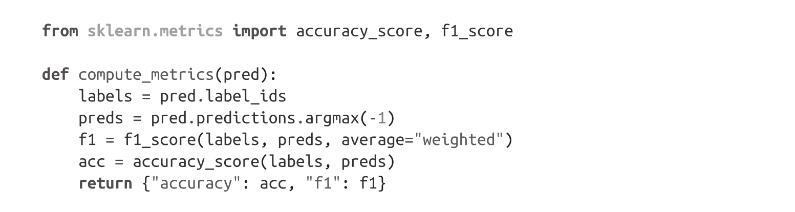 为了在训练期间监控指标,我们需要为Trainer定义一个compute_metrics()函数。该函数接收一个EvalPrediction对象(这是一个具有predictions和label_ids属性的命名元组),并需要返回一个将每个指标名称映射到其值的字典。对于我们的应用,我们将计算模型的F1分数和准确率: