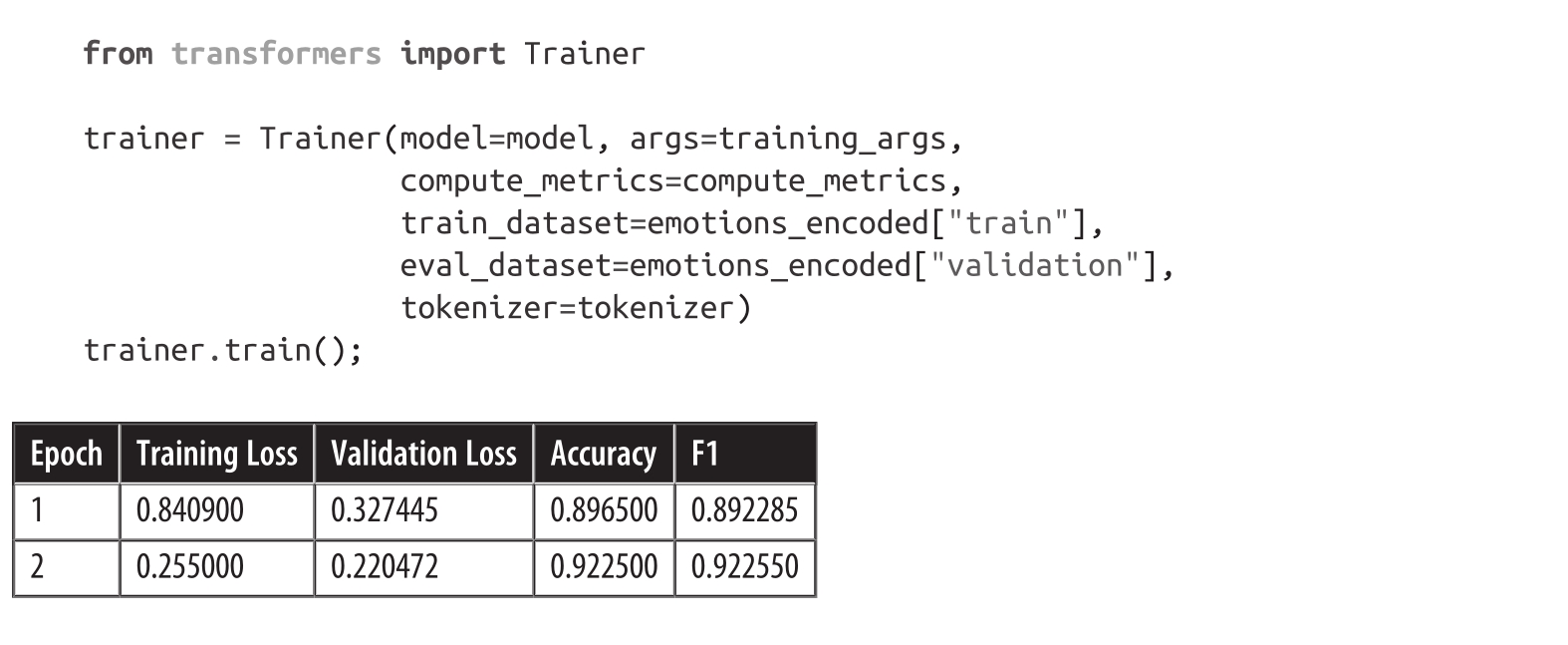 这里我们还设置了批量大小、学习率和迭代轮数,并指定在训练运行结束时加载最佳模型。所有组件都齐全了,我们可以使用Trainer实例化和微调我们的模型: