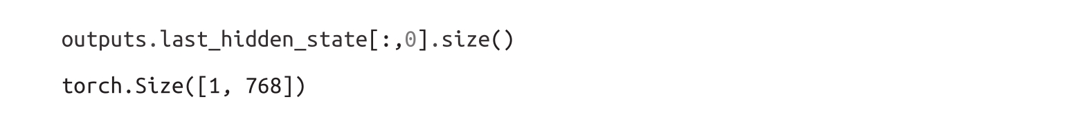 我们可以看到,隐藏状态张量的形状为[batch_size,n_tokens,hidden_dim]。换句话说,对于每个输入词元,都会返回一个768维向量。对于分类任务,通常惯例是只使用与[CLS]词元关联的隐藏状态作为输入特征。由于此词元出现在每个序列的开头,我们可以通过简单地索引outputs.last_hidden_state来提取它,如下所示: