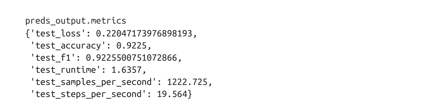 predict()方法的输出是一个PredictionOutput对象,它包含了predictions和label_ids的数组,以及我们传给训练器的度量指标。我们可以通过以下方式访问验证集上的度量指标: