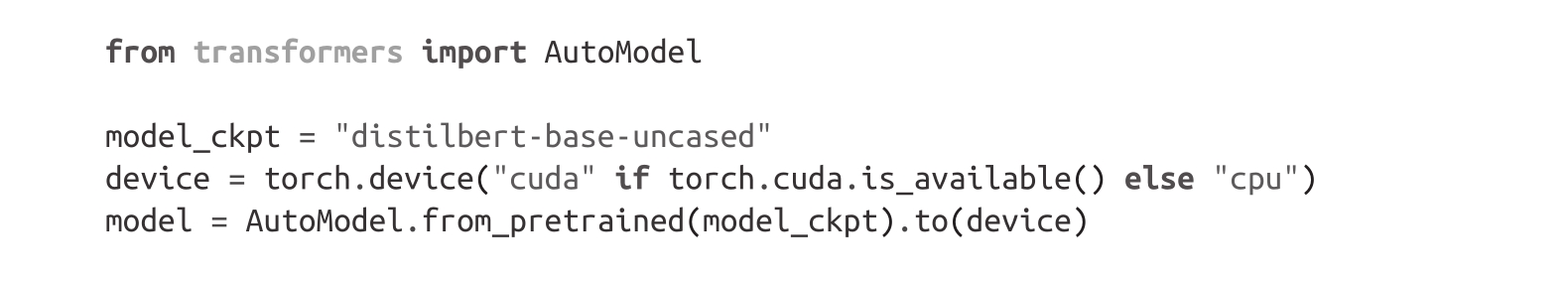 我们将使用Hugging Face Transformers库中另一个很方便的自动类AutoModel。与AutoTokenizer类似,AutoModel具有from_pretrained()方法,可用于加载预训练模型的权重。现在我们使用该方法来加载DistilBERT checkpoint: