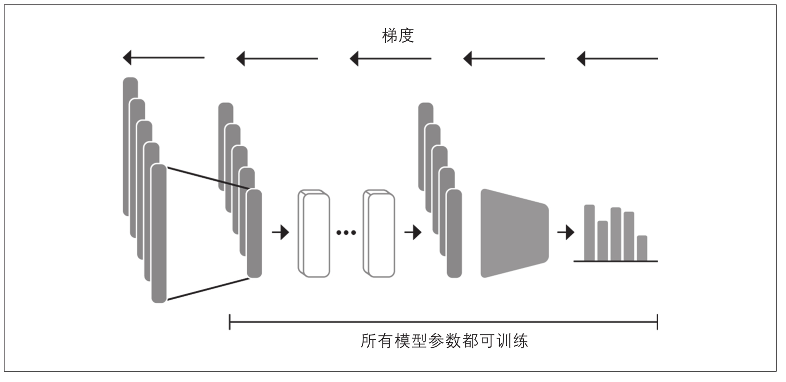 现在我们探讨如何进行端到端的Transformer模型微调。在使用微调方法时,我们不使用隐藏状态作为固定特征,而是如图2-6所示那样进行训练。这要求分类头是可微的,这就是为什么这种方法通常使用神经网络进行分类。