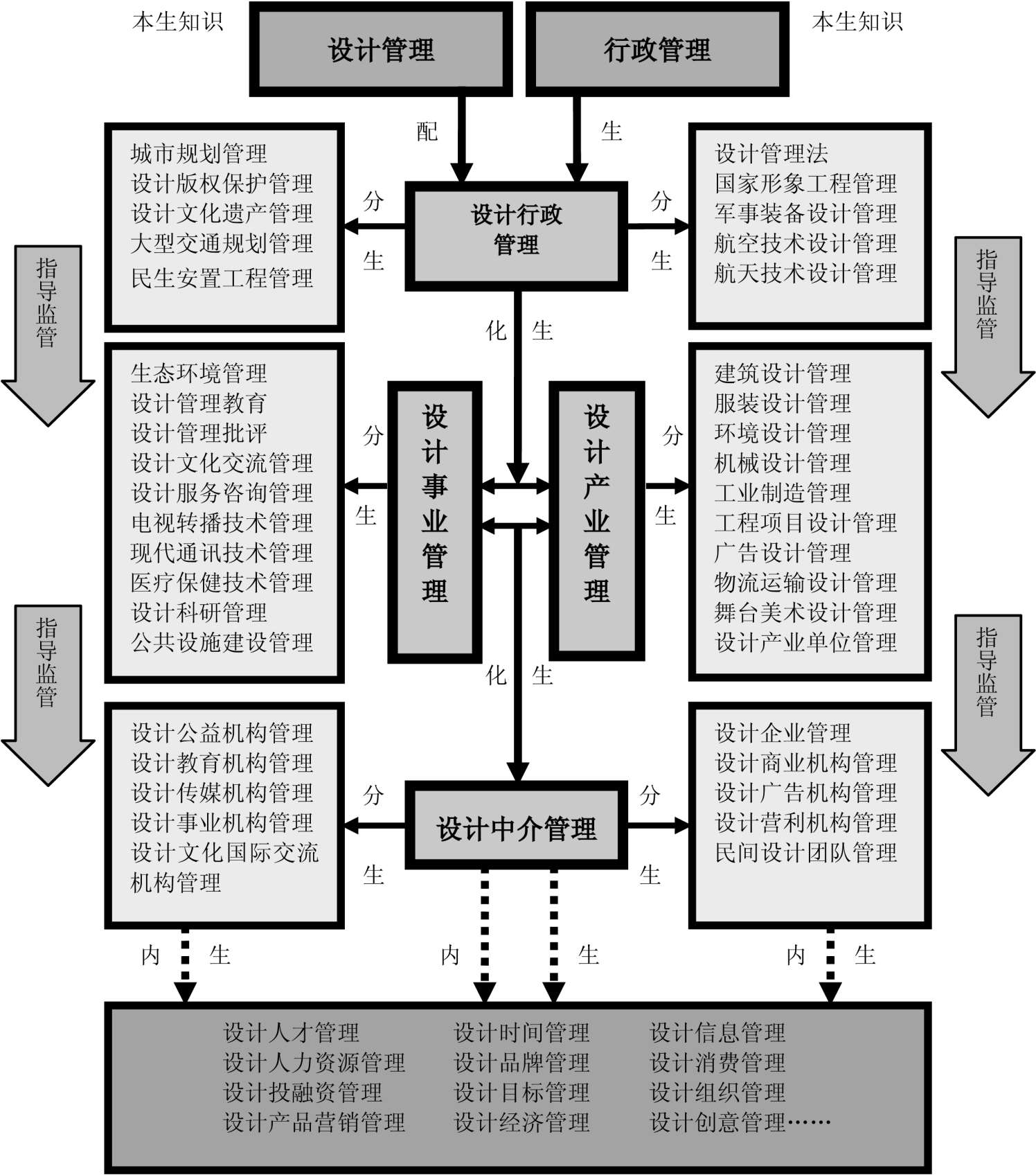 设计管理与行政管理的配对交叉可以生成设计行政管理(配生法),根据设计行政管理可以生发出设计事业管理和设计产业管理(同词性的化生法),进而可以继续生发出设计中介管理(同词性的化生法)。这些设计管理其实都是围绕人、财、物、创意、项目、品牌、市场营销等内容而展开的管理,所以又生发出一系列的设计管理(内生法)。设计行政管理、设计事业管理、设计产业管理、设计中介管理又可以生发出各自主要的设计管理知识体系(门类或职能性分生法)。当然,设计行政管理会对设计事业管理、设计产业管理行使必然的指导监管,而设计事业管理、设计产业管理又会对设计中介管理行使必然的指导监管,四类管理之间没有必然的鸿沟,具备管理行为和管理事务上紧密的交叉与融合,切不可生硬地把它们人为地切割开来。宏、中、微三层划分的相对性希望能得到大家的重视,不能认为三者之间就必然失去了关联和交错,这绝非笔者本意!