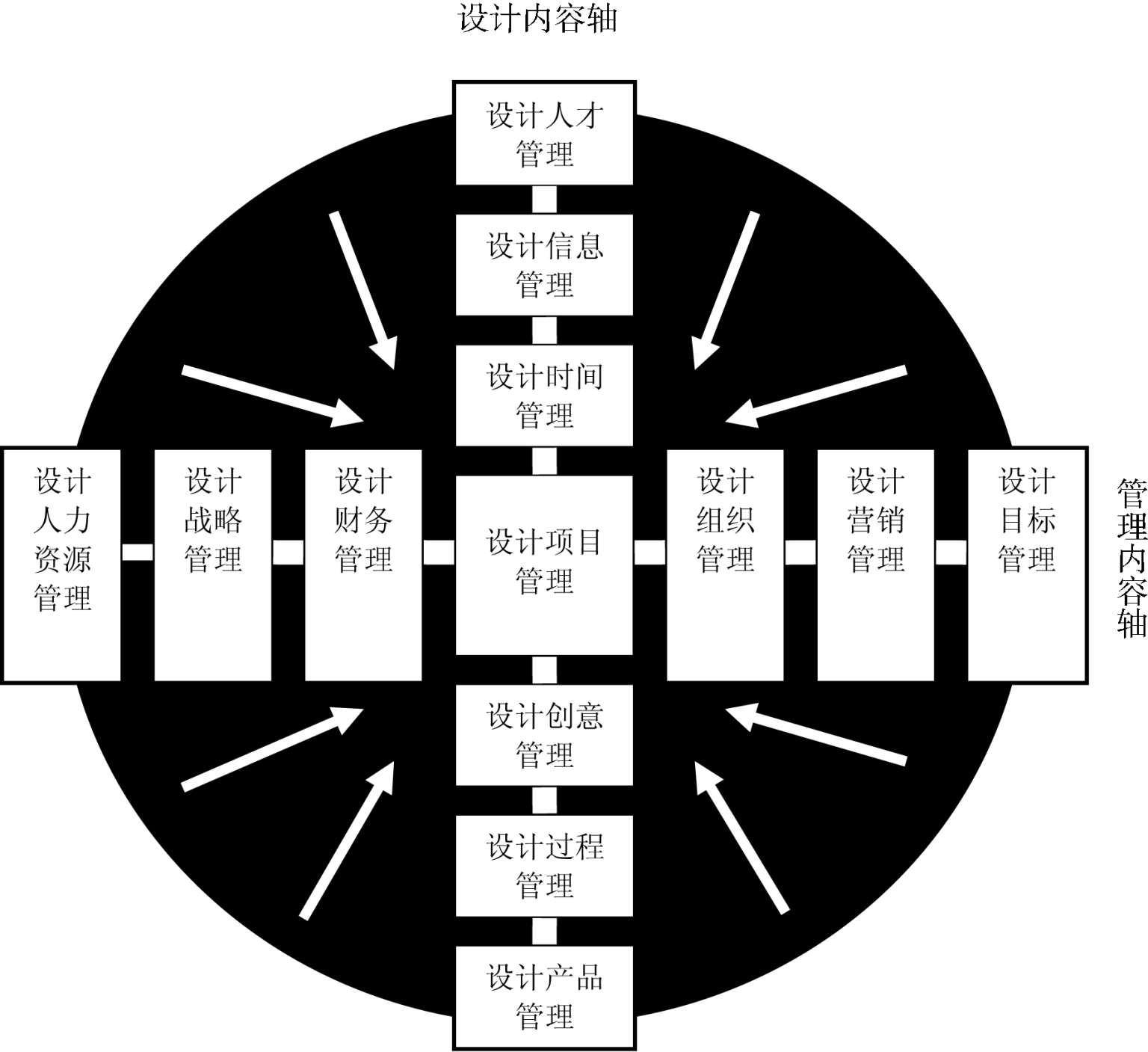 一个系统的设计管理活动可以从两个方面对其做出解析,即设计方面和管理方面。如果从设计方面入手可以将设计分成几个部类:设计人才、设计项目、设计信息、设计时间、设计过程、设计产品、设计评价,那么设计管理就可以根据这一内生系统产生设计人才管理、设计项目管理、设计信息管理、设计时间管理、设计过程管理、设计产品管理、设计评价管理等,其中尤以设计项目管理为一切设计管理的中心或基础,设计项目(Design Project)是设计活动的主体部件,换句话说,设计项目的运营往往就是设计的主要活动,没有项目就不存在设计活动,
