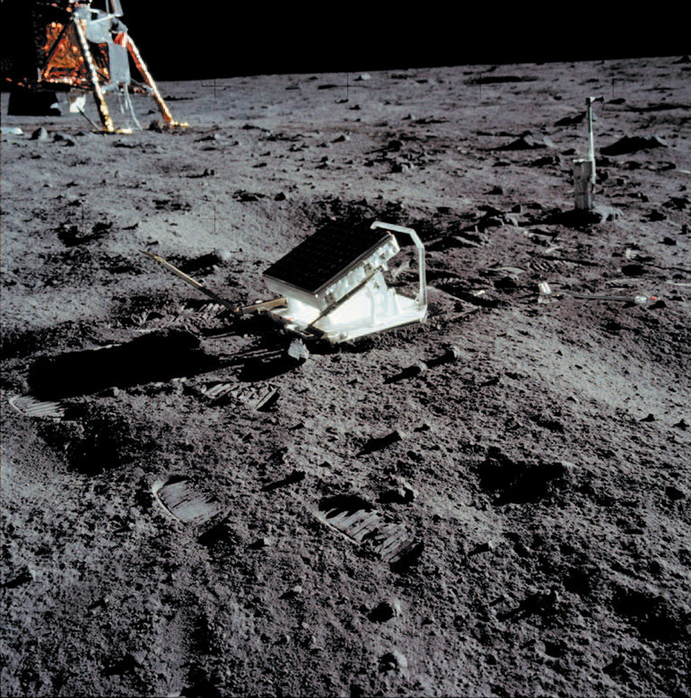 图15 照片中央是“阿波罗11号”为激光测距实验安置的后向反射器,左上角是“阿波罗11号”着陆器,下方有几个清晰的宇航员足迹