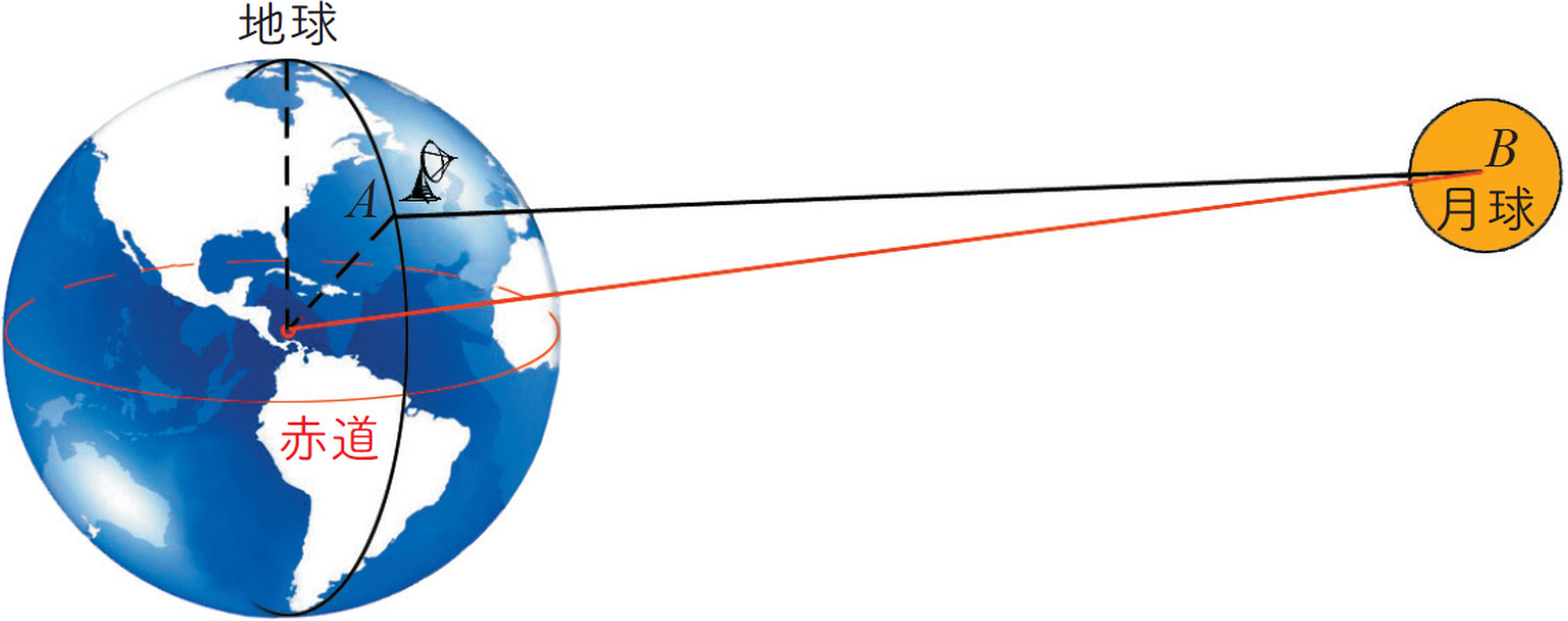 图13 雷达测月示意图。 A 是地球上的一座天文台,它的雷达发出的无线电脉冲从月球上的 B 点反射回来