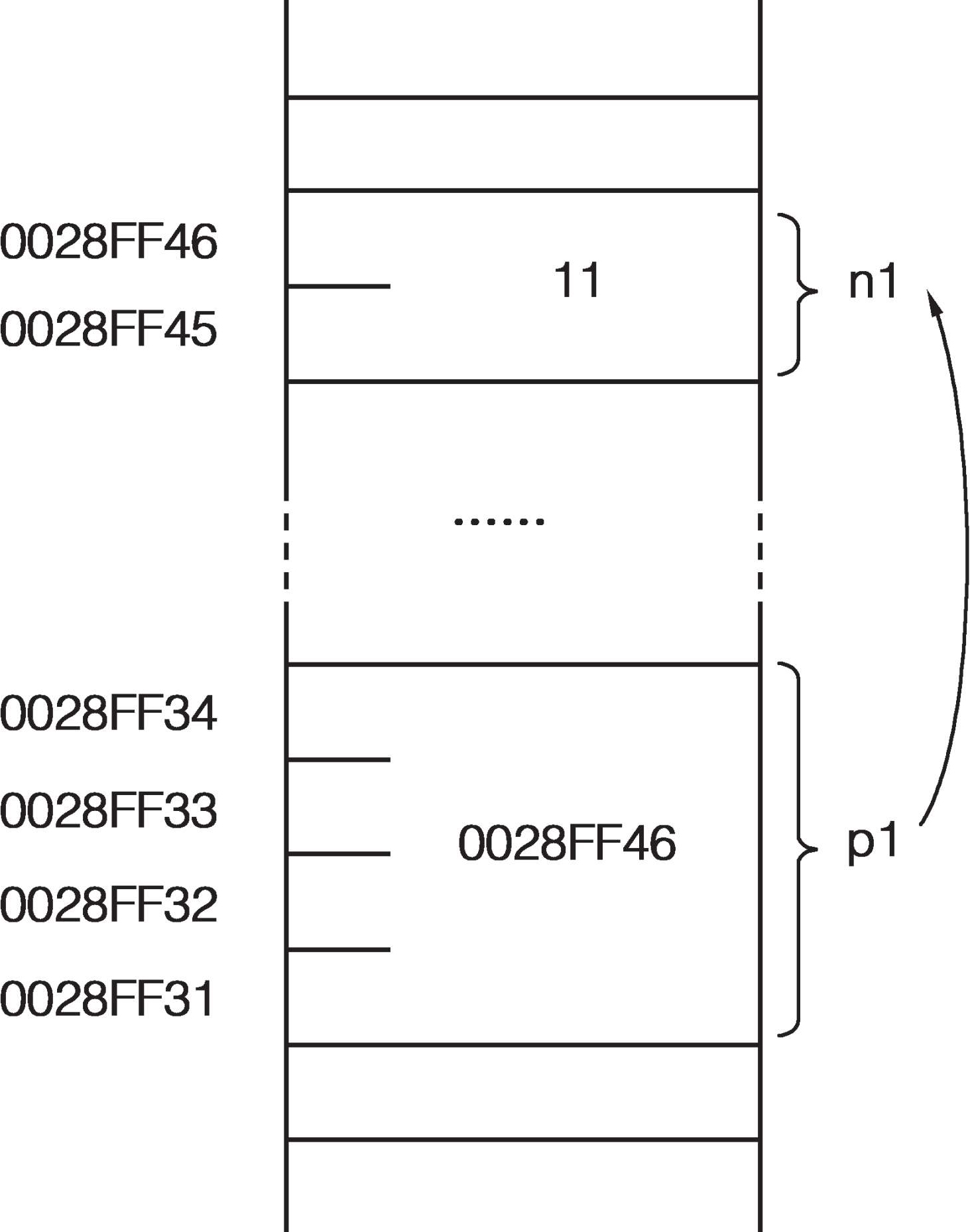 (3)根据程序运行结果和如下示意图,你会发现变量p1和n1之间有(有、没有)关系吗?是哪一条语句使它们建立了联系,在程序中标志出来。