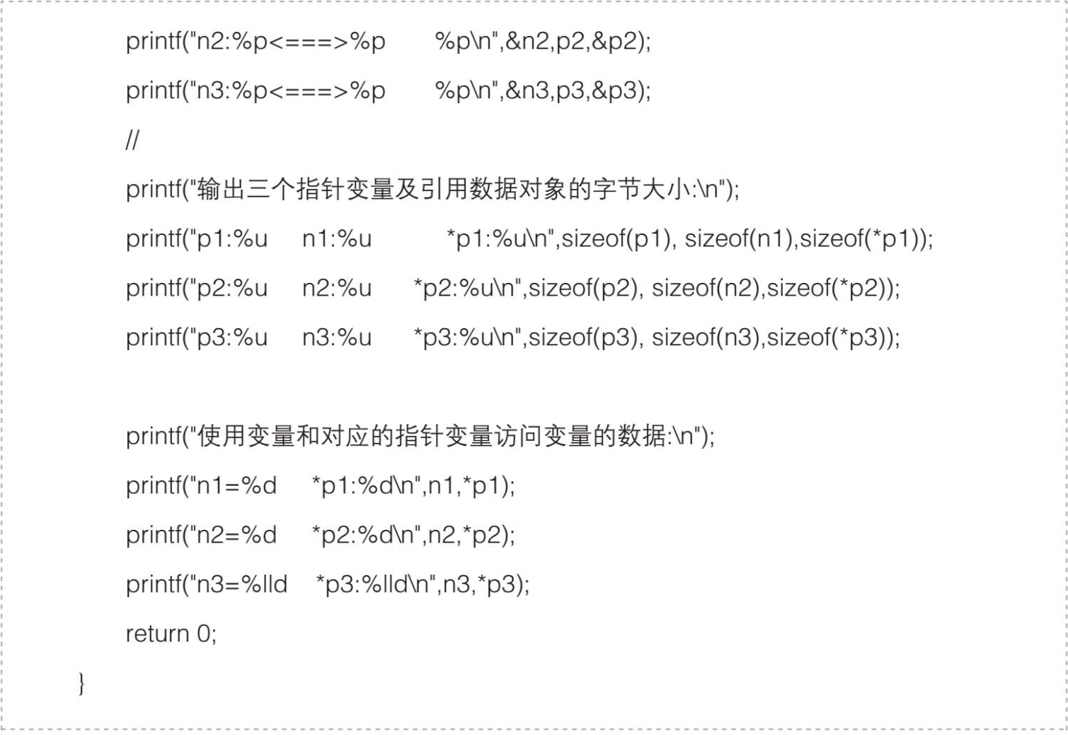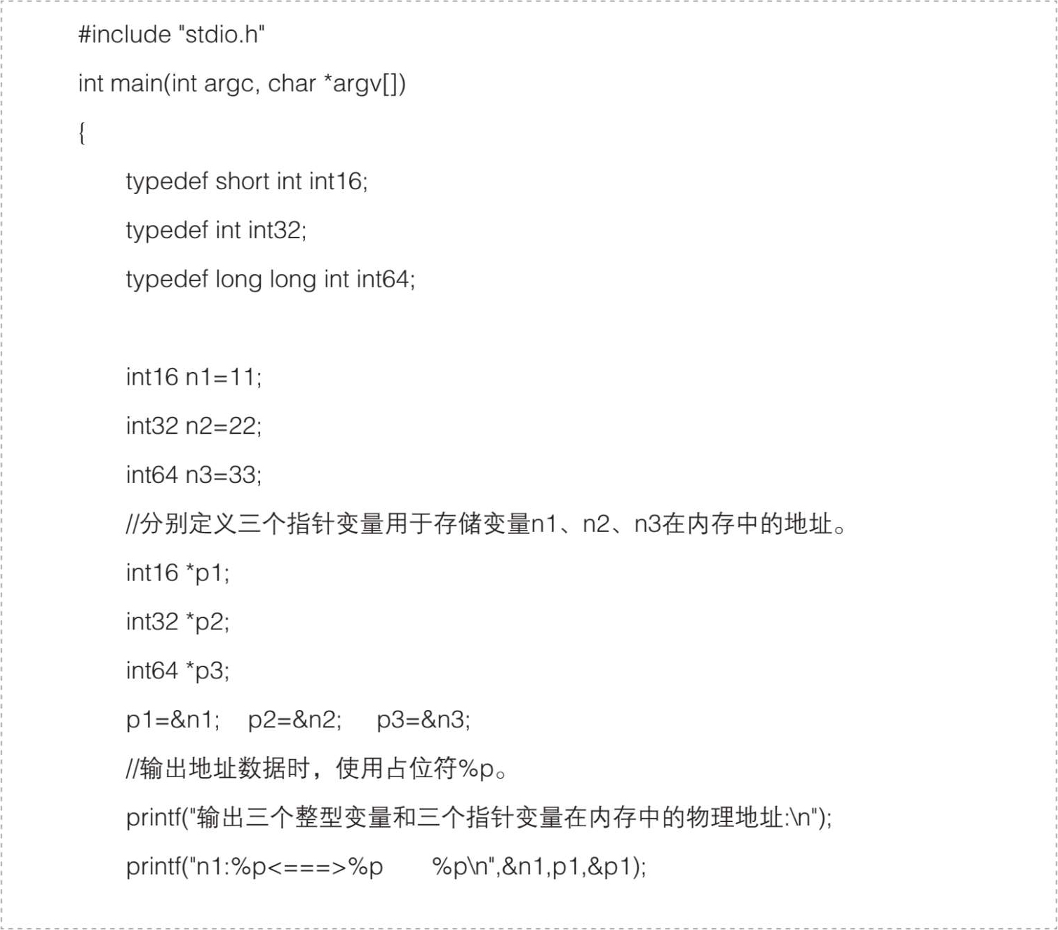 (2)内存单元的物理地址是为访问该内存单元而分配的一个编号,本质上是一个无符号整数。由于其目的是访问对应的内存单元,所以存储、传输、操作变量的物理地址有别于无符号整数,需要使用专门的被称为指针类型的变量来实现。在程序中圈出指针变量,并归纳声明指针变量的方法。