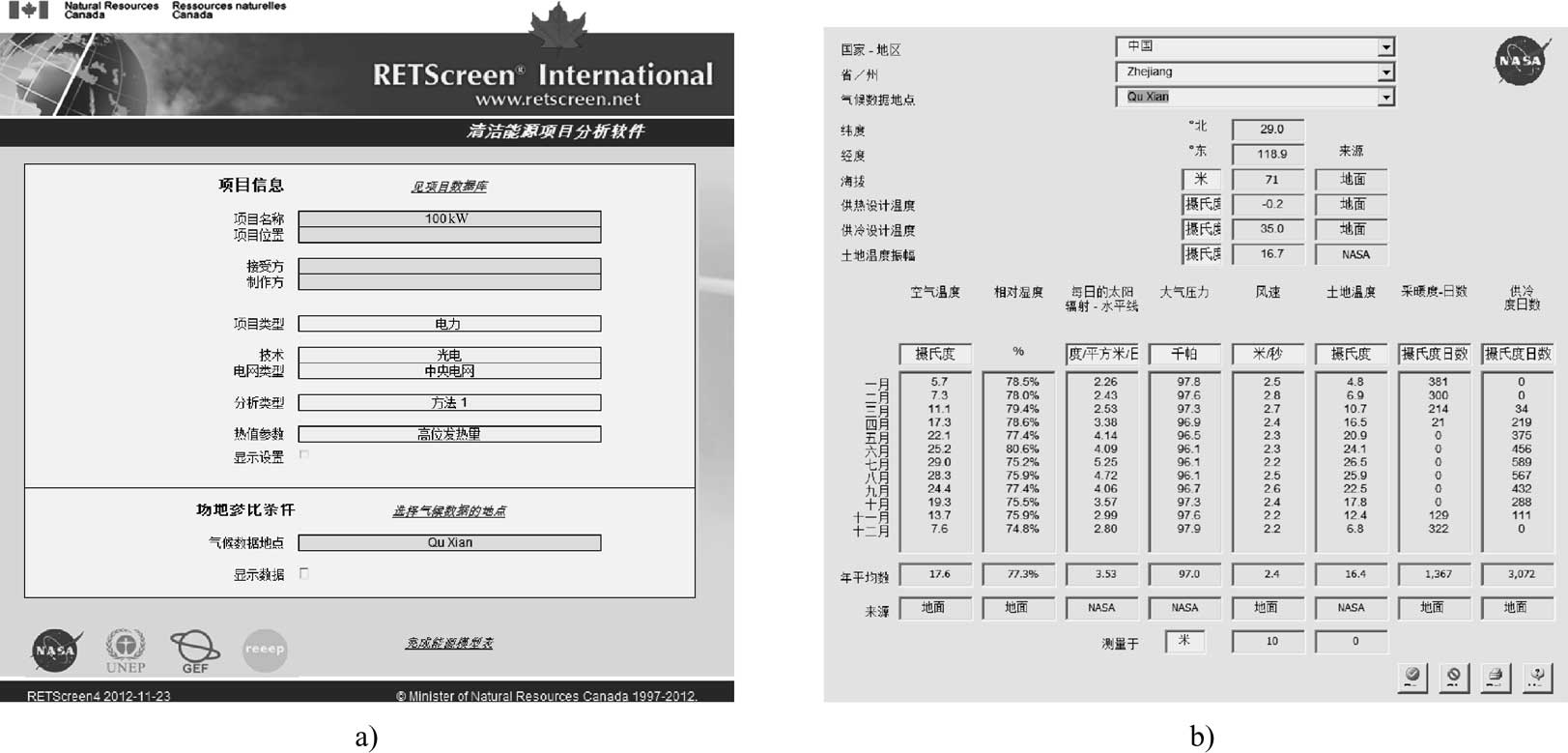 RETScreen是清洁能源分析与决策的管理软件。这个工具的核心是由已标准化和集成化的清洁能源分析软件构成,可以为不同类型的节能和可再生能源工程的能源产量、周期成本以及温室气体的减排量做出评估。每个RETScreen能源工程模型(如光伏项目等)都可以在Excel的“工作手册”文件中开发。“工作手册”文件是由一系列的工作表组成的,这些工作表有公共的界面且与所有的RETScreen模型都有相匹配的标准方式。