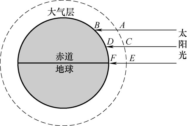 太阳辐射量是由低纬度向高纬度逐渐减弱的。假定不同纬度地区的大气透明度是相同的,在这样的条件下进行比较,如图1-7所示,春分中午时刻的太阳垂直照射到地球赤道 F 点上,假设同一经度上有另外两点 B 、 D ,且 B 点纬度比 D 点纬度高。阳光射到 B 点所需经过大气层的路程 AB 比阳光射到 D 点所经过大气层的路程 CD 长。所以 B 点的垂直辐射量比 D 点小。在赤道 F 点垂直辐射量很大,因为阳光在大气层中经过的路程 EF 最短。