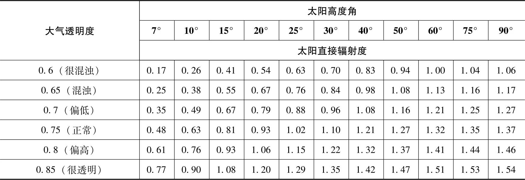 表1-5 不同太阳高度角和大气透明度下的太阳直接辐射度