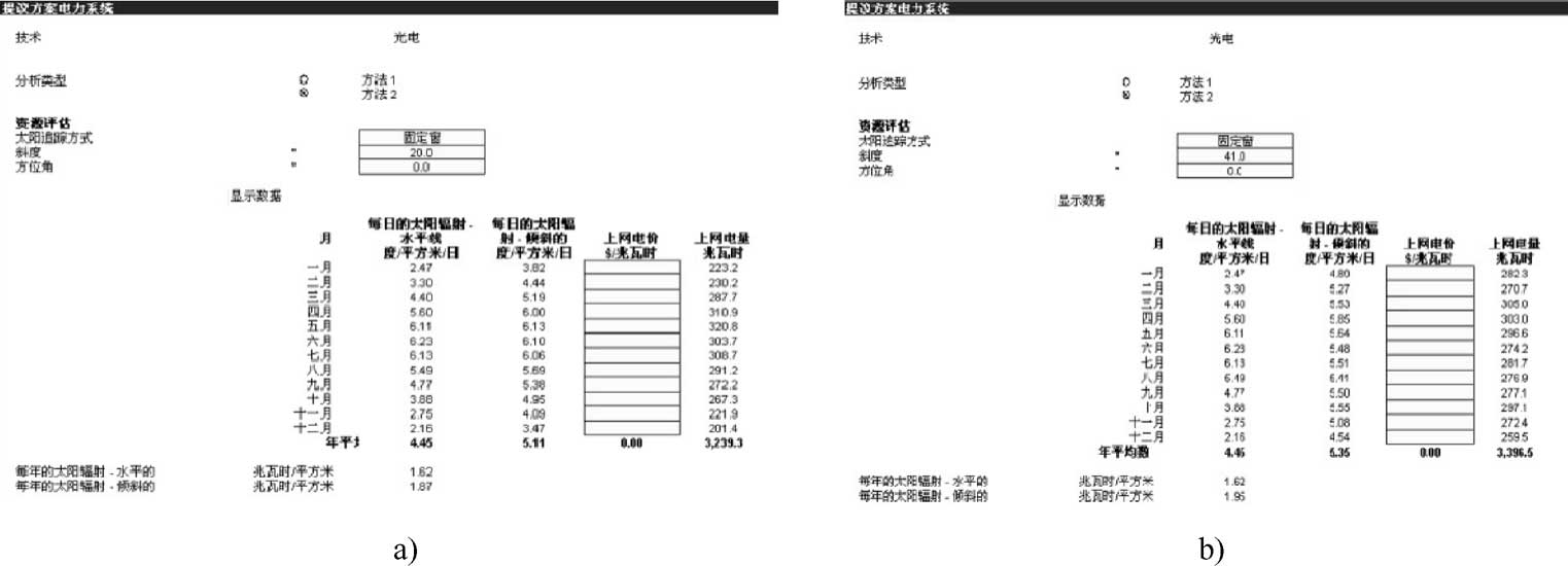 在能源模型对话框的“分析类型”选项中单击“方法2”单选按钮;在“资源评估”栏中,将“太阳追踪方式”选择“固定窗”,“方位角”设置为0°;在“斜度”选择上,通过不断更换斜度值,分析该地区最佳倾斜角或固定斜度下倾斜面的辐射量,如图1-12所示是倾斜角(斜度)分别为20°和41°时各月的辐射量值。