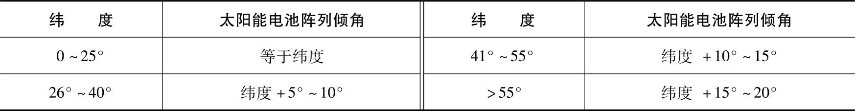 在没有计算机仿真软件的情况下,也可以根据当地纬度粗略确定固定太阳能电池阵列的倾角。为消除冬夏辐射量的差距,一般纬度越高倾角也越大,如表1-7所示。