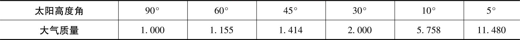 太阳辐射受到衰减作用的大小,与太阳辐射穿过大气路程的长短有关。路程越长,能量损失就越多;路程越短,能量损失越少。大气质量就是太阳辐射通过大气层的无量纲路程,将其定义为太阳光通过大气层的路径与太阳光在天顶方向时射向地面的路径之比。令海平面上太阳光垂直入射路径为1,即无量纲路程为m=1,大气质量与太阳高度角的关系如表1-4所示。