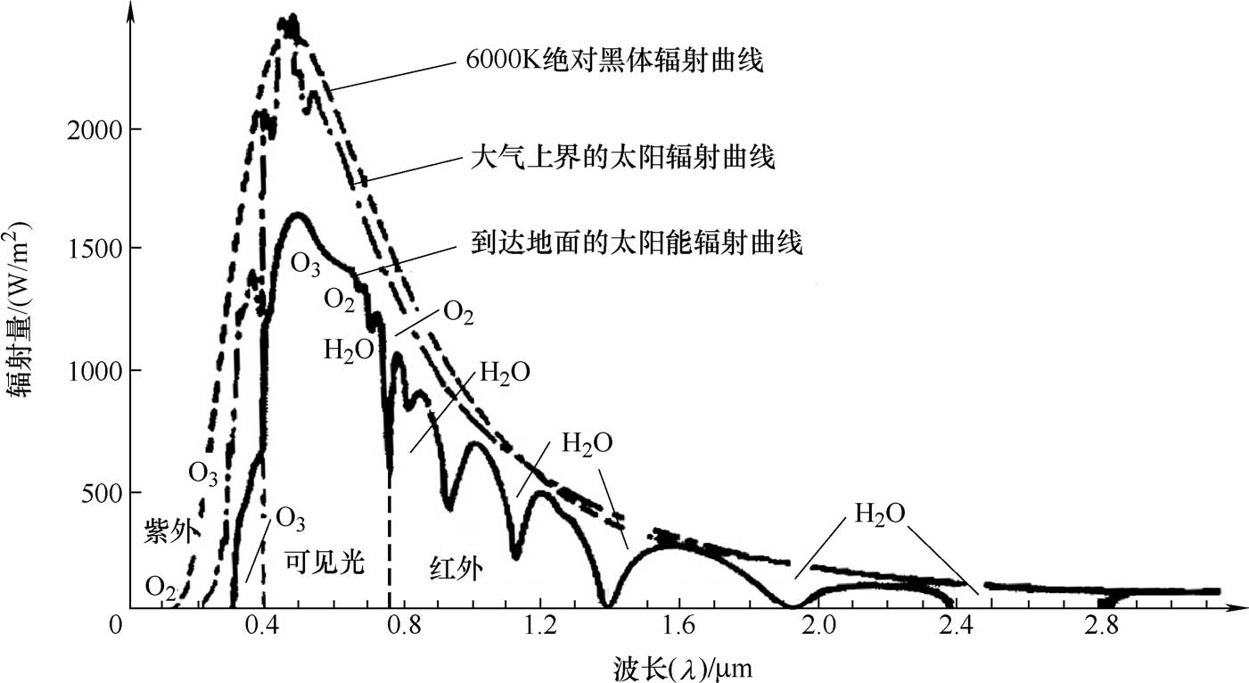 太阳辐射中辐射能按波长的分布,称为太阳辐射光谱,如图1-6所示。从图中可看出,大气上界太阳光谱能量分布曲线,与用普朗克黑体辐射公式计算出的6000 K的黑体光谱能量分布曲线非常相似,因此可以把太阳辐射看作黑体辐射。太阳是一个炽热的气体球,其表面温度约为6000K,内部温度更高。根据维恩位移定律可以计算出太阳辐射峰值的波长 λ max 为0.475μm,这个波长在可见光的青光部分。太阳辐射主要集中在可见光部分(0.4~0.76μm),波长大于可见光的红外线(>0.76μm)和小于可见光的紫外线(<0.4μm)的部分少。在全部辐射能中,波长在0.15~4μm之间的占99%以上,且主要分布在可见光区和红外线区,前者占太阳辐射总能量的约50%,后者占约43%,紫外线区的太阳辐射能很少,只占总量的约7%。