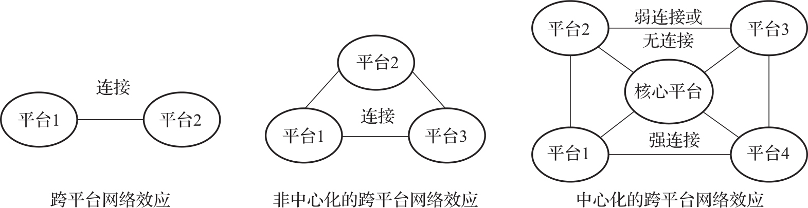 跨平台网络效应包含非中心化的跨平台网络效应与中心化的跨平台网络效应。非中心化跨平台网络效应是指形成网络效应的平台之间没有明显从属关系,网络效应的产生是基于互补业务或战略合作;中心化跨平台网络效应是指形成网络效应的平台中有一个核心平台,它同时连接一个或多个其他平台,其他平台是核心平台的业务延伸或渠道拓展。多数跨平台网络效应属于中心化网络效应,即具有明确的核心平台,企业为实现核心平台的网络效应而自己建立新平台与之互动,或借助其他企业平台渠道实现业务拓展,可操作性较强。而只有少数跨平台网络效应是非中心化的,因为非中心化跨平台网络效应要求平台之间的业务必须是高度互补的,这在高度趋同的互联网环境下是难以实现的,所以较多的非中心化跨平台网络效应都发生在同一集团企业下设的不同平台之间,具体如图2-4所示
