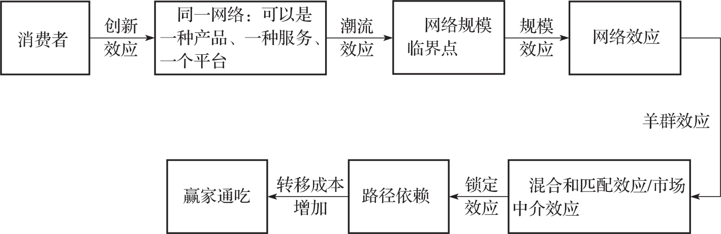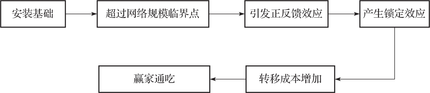 第六,在网络效应、市场中介效应的双重正反馈作用下,产生消费者标准的锁定效应。锁定效应的本质是产业集群在生命周期演进过程中产生的一种路径依赖现象(Arthur,1989)。消费者增加转移成本,从而产生赢家通吃的市场现象,形成垄断市场。赢家通吃现象的发生主要依赖三个先决条件,即高度跨边网络效应、高度同边网络效应、高度转换成本(陈威如,2013)。