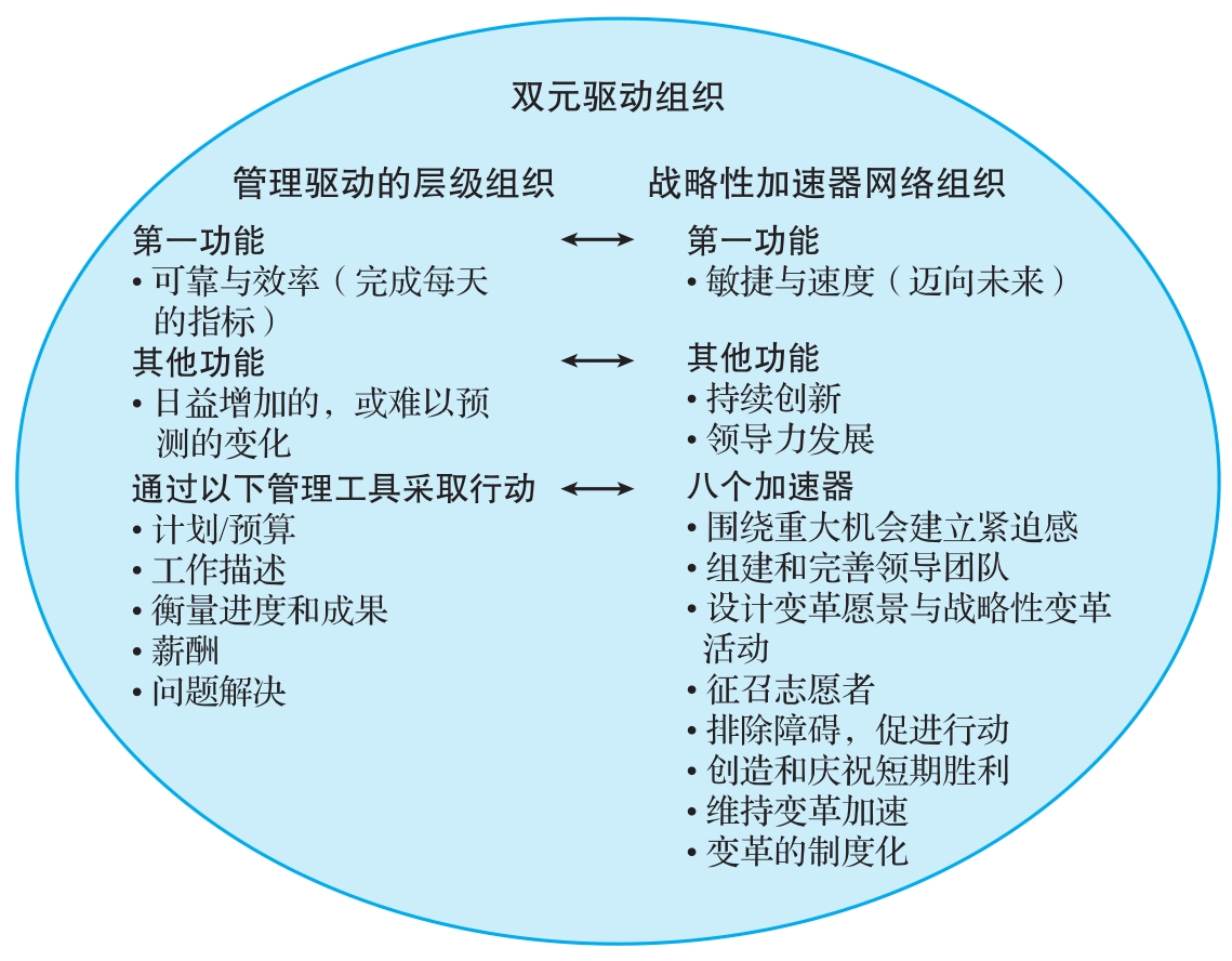 1.0版本可能无关乎战略制定或调整,而只是聚焦于敏捷、创新的执行。它最初可能更像是一次大规模的员工敬业度提升活动,在不增加预算的情况下创造更大的回报。但是,网络组织和加速器会不断演变,势头可能发展得比你想象的还要快。只要执行委员会理解这套新的系统,发挥其作用,只要新的组织确实能够帮助组织应对竞争挑战,整个双元驱动组织的模式最终就会渗入组织文化中,成为“我们这里习惯的做事方式”。