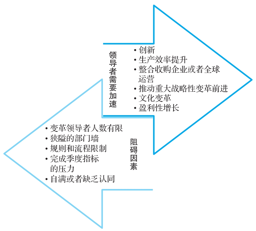 自满、缺乏认同、过去成功的产品,都会让情况变得复杂。只要有一点自满,人们就不愿意接受新东西,想方设法抵制改变。缺乏足够的认同的人认为企业需要一些新的东西,但不是高层提出的战略性创新措施。这两种态度都会阻碍变革的加速,如图1-5所示。