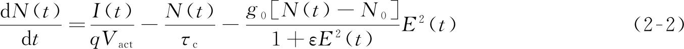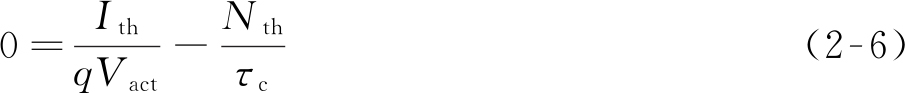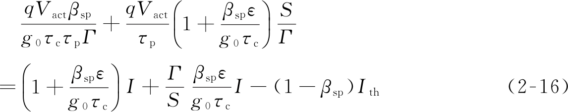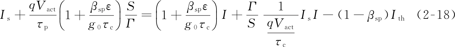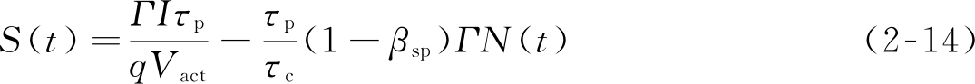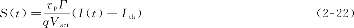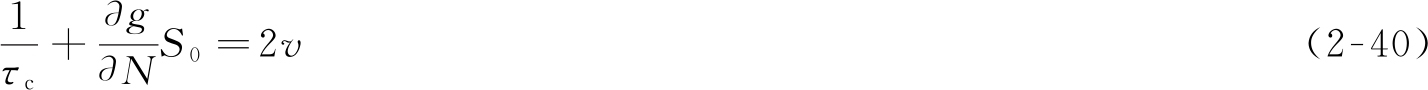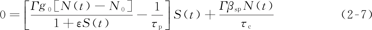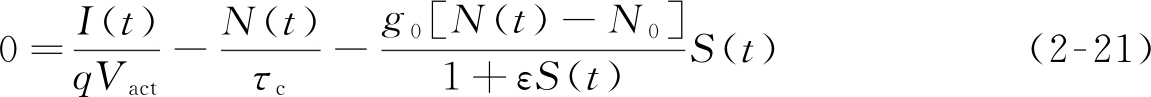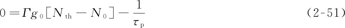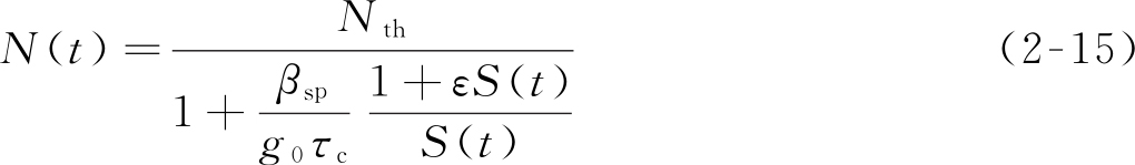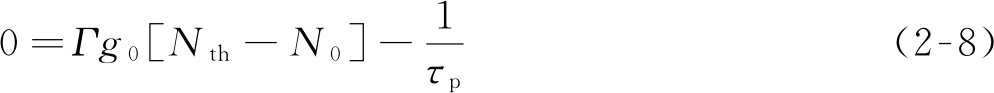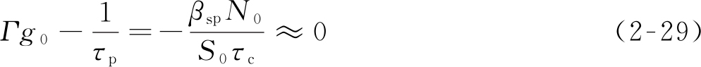 由于半导体激光器在阈值电流时, β sp 和( β sp ε )/( g 0 τ c )远远小于1,因此式(2-18)可以化简为