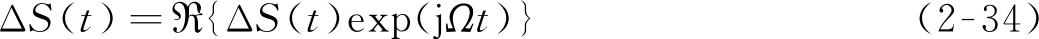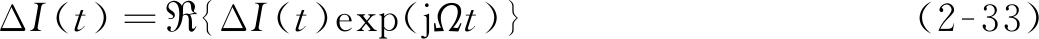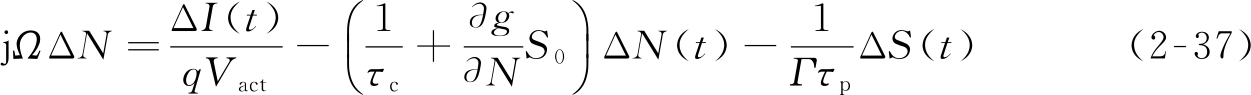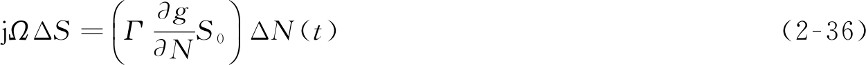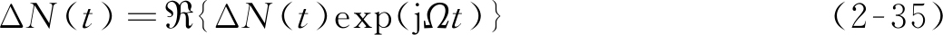 半导体激光器的偏置电流、光子密度和载流子密度都是由幅度(实部)和频率(虚部)共同组成的,则它们分别表示为式(2-33)、式(2-34)和式(2-35),式中 Ω 表示角频率: