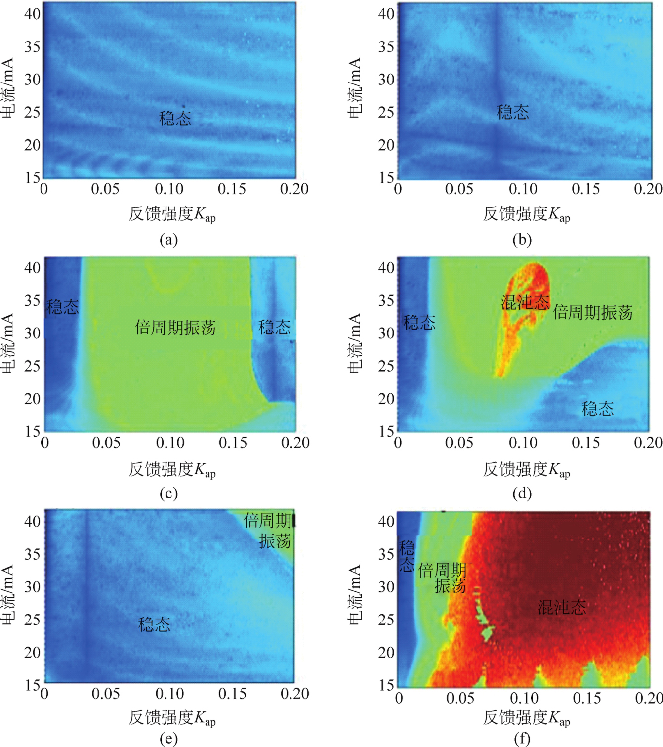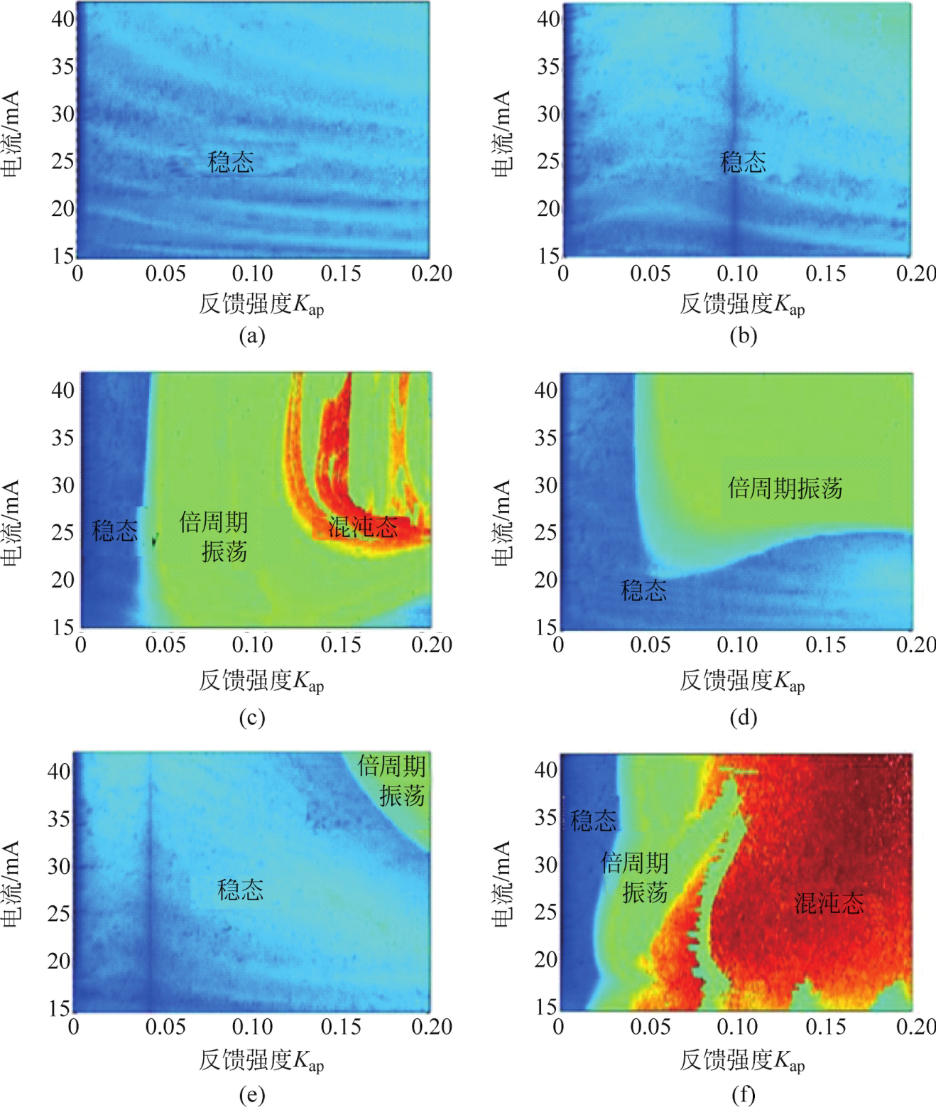 当反馈腔长增加到5 mm时,系统的混沌态消失,稳态和倍周期振荡状态增加,如图2-23(d)所示。当反馈强度小于0.04,或电流小于20 mA时,系统处于稳态,由蓝色表示;反馈强度大于0.04,偏置电流大于20 mA时,系统处于倍周期振荡状态,用绿色表示。