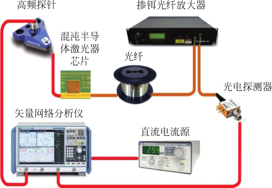 图2-13为半导体激光器芯片的频率响应实验测试装置。图中的光纤和掺铒光纤放大器在测光纤中混沌半导体激光器芯片的频率响应曲线时会用到,实验过程中矢量网络分析仪提供的交流信号功率为-20 dBm,具体实验操作如下。