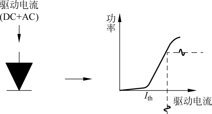 强度调制响应是反映半导体激光器在光波通信系统中调制速度快慢最重要的特性之一,小信号调制频率响应的原理是在半导体激光器的偏置电流大于阈值电流时,同时给半导体激光器加直流偏置电流和连续正弦波调制电流信号,半导体激光器的输出功率信号将随着连续正弦波调制电流信号的频率和功率的变化而变化,当半导体激光器直流偏置电流改变时,半导体激光器的输出功率会有不同的频率响应特性。图2-12是半导体激光器小信号电流调制原理图。常用的测试半导体激光器频率响应曲线的仪器为微波矢量网络分析仪和光波元件分析仪,这里采用的是微波矢量网络分析仪,以下统称为矢量网络分析仪。