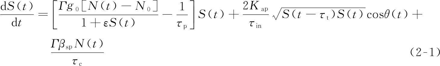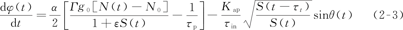 结合半导体激光器的速率方程,可以推导出所设计的基于外光反馈短腔混合集成混沌半导体激光器的速率方程,即著名的L-K方程 [21-22] 。方程反映了半导体激光器的光子密度 S ( t )、激光器有源腔内载流子密度 N ( t )和相位 φ ( t )随时间的动态变化: