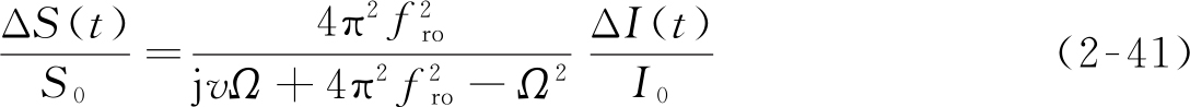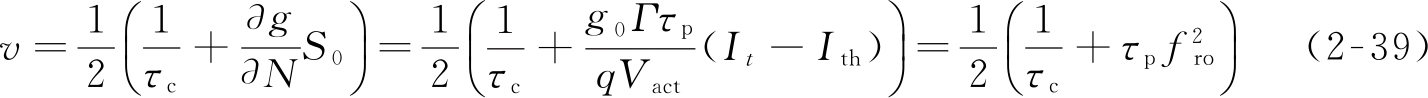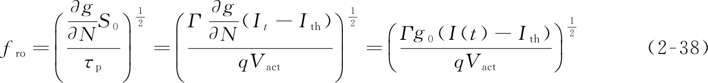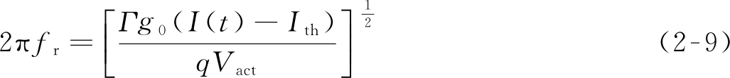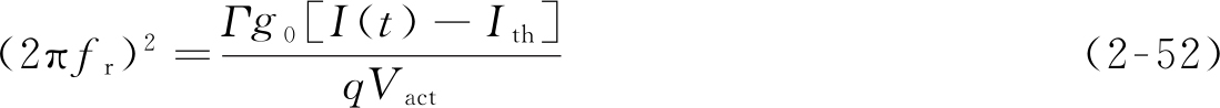 式(2-38)中 f ro 表示半导体激光器的弛豫振荡频率,式(2-39)中 v 表示半导体激光器的阻尼系数。将上式联立可以得到半导体激光器的输出和输入电流的关系式