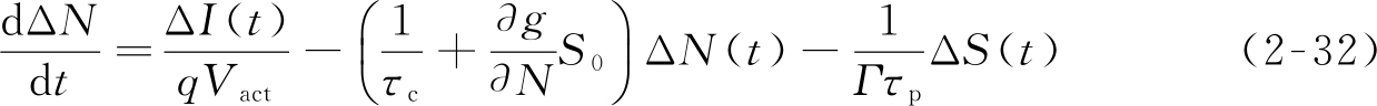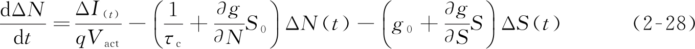 设半导体激光器的偏置电流为 I 0 ( I 0 > I th ),半导体激光器的光子密度为 S 0 ,载流子密度为 N 0 。Δ I ( t )表示小信号调制电流,则半导体激光器的总注入电流由式(2-23)表示,总的光子密度由式(2-24)表示,总的载流子密度由式(2-25)表示,具体如下: