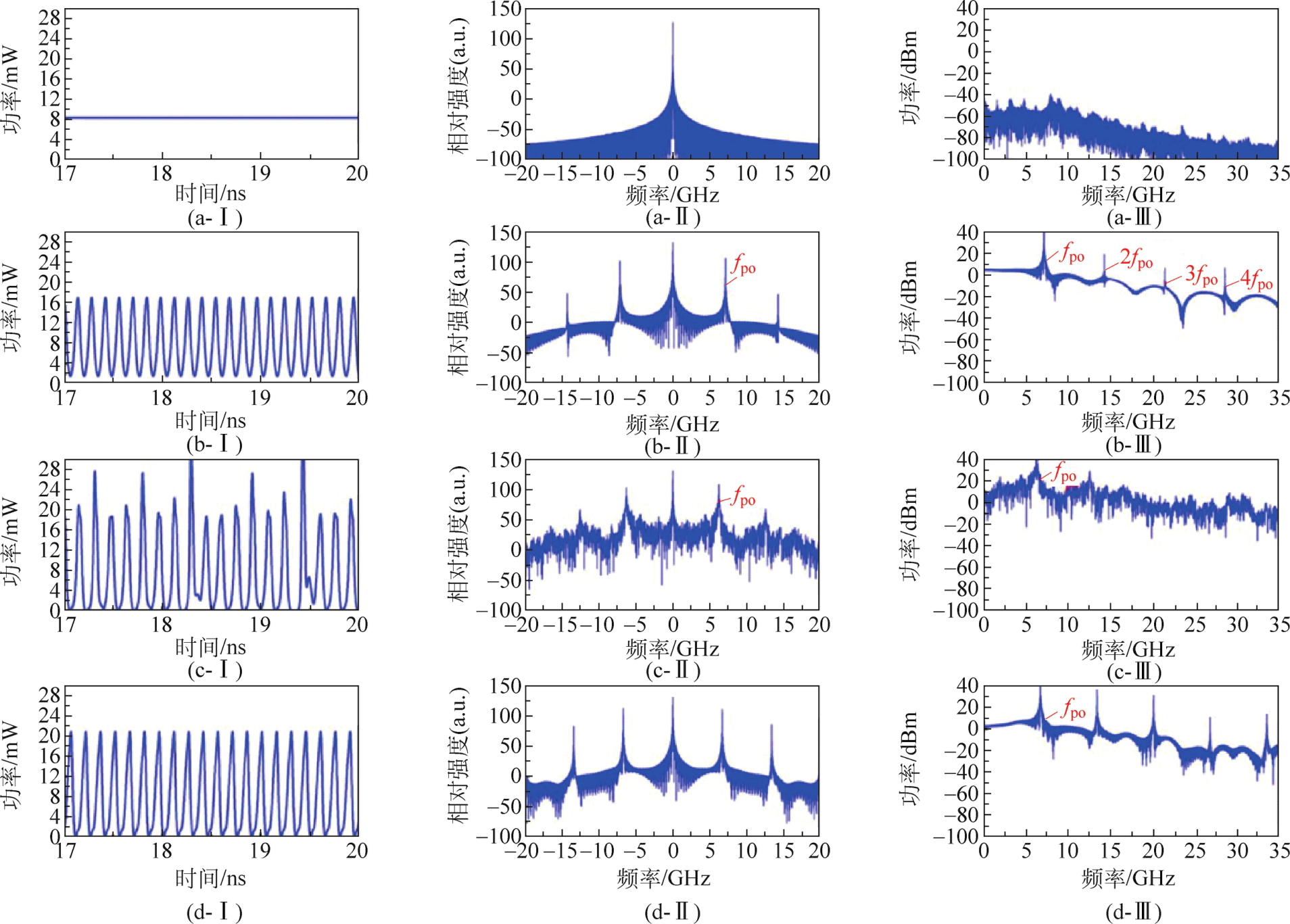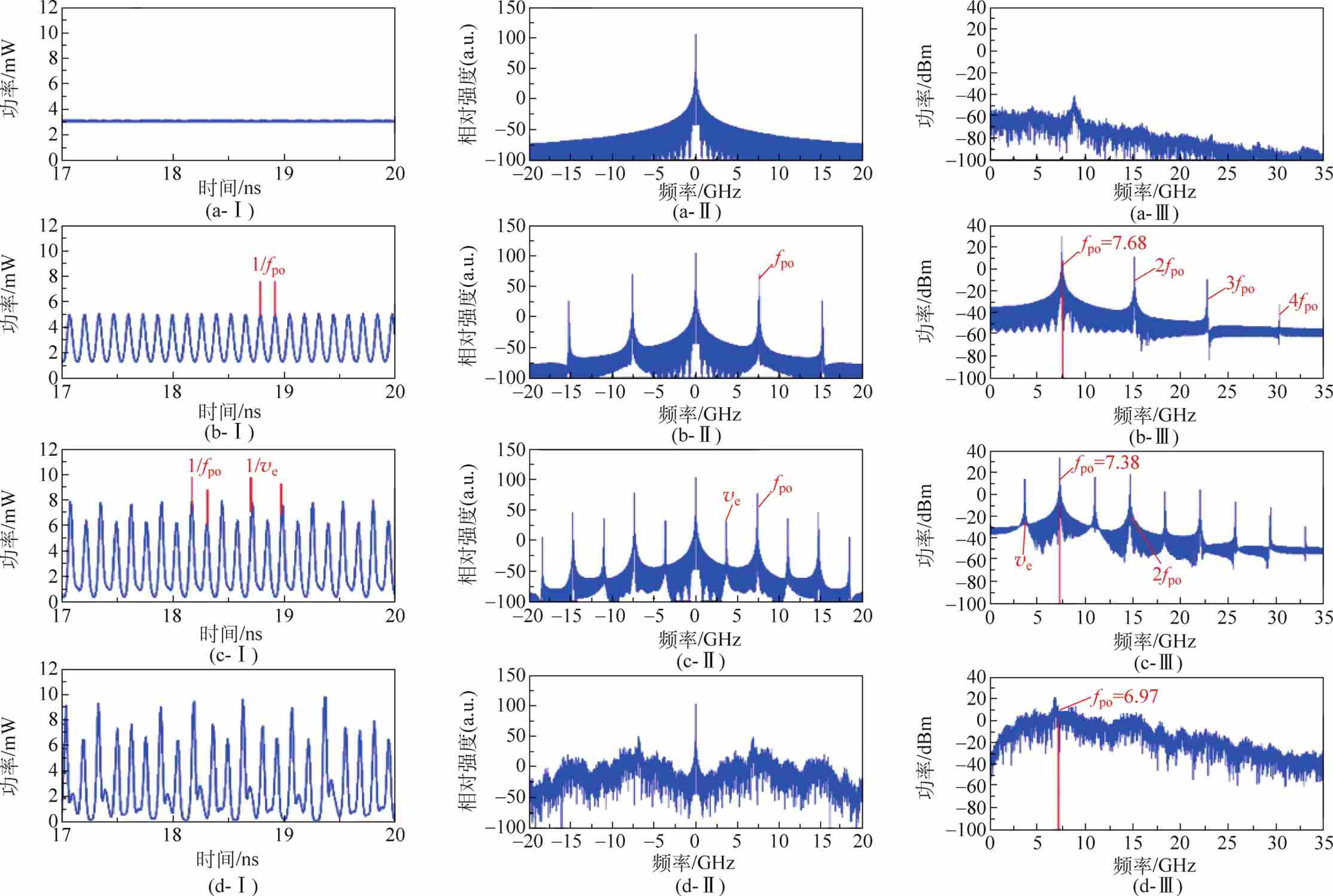 图2-20(b)表示反馈强度为0.07时,由于反馈扰动增强,激光器某些阻尼振荡变为非阻尼振荡。新振荡的增加使系统由稳态变为单倍周期振荡的状态。图2-20(b-Ⅰ)是单倍周期的时序图,此时激光器的输出状态为周期等于1/ f po 的振荡波形,并且此时激光器的输出只有一个极大值;而此时图2-20(b-Ⅲ)频谱上的四个峰值频率分别对应激光器的弛豫振荡频率及其高次谐波,高次谐波频率分别为2 f po 、3 f po 和4 f po 。