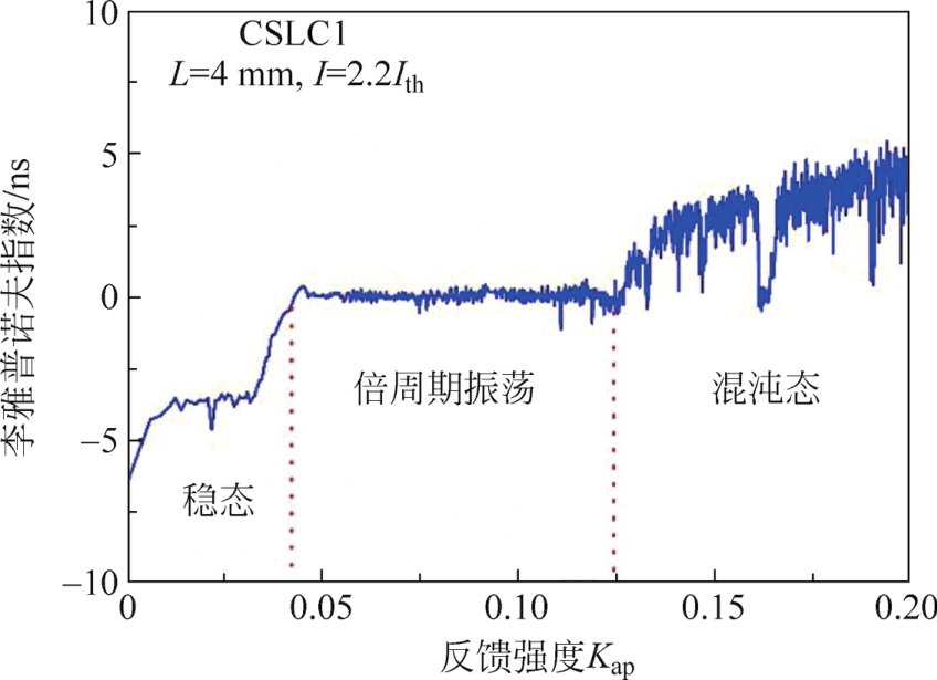 图2-25(c)描述的是外反馈腔长为4 mm时系统的动态特性,从图中可以看出,当反馈强度在0~0.03和0.16~0.20时,系统处于稳态;当反馈强度在0.03~0.16时,系统处于倍周期振荡状态,系统不存在混沌态,这与芯片1在外腔长为4 mm时的动力学特性完全不同。