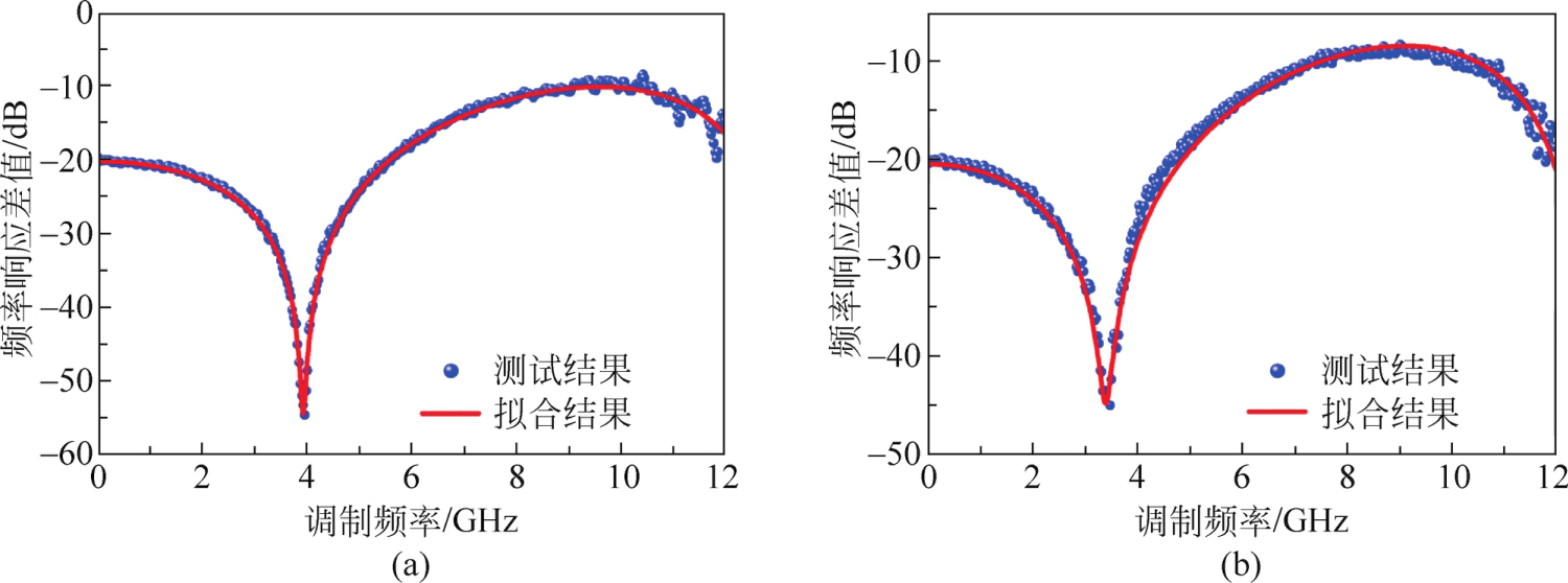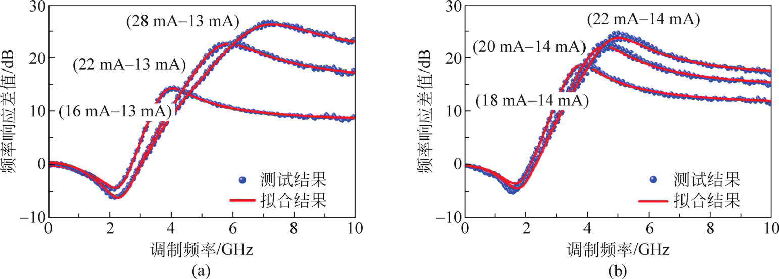 (a)半导体激光器芯片1较大偏置电流下频率响应曲线减去13 mA的频率响应曲线的拟合结果;(b)半导体激光器芯片2较大偏置电流下频率响应曲线减去14 mA的频率响应曲线的拟合结果