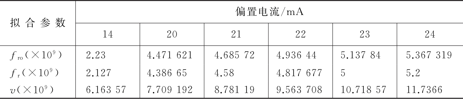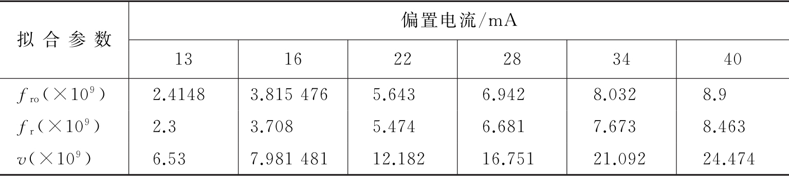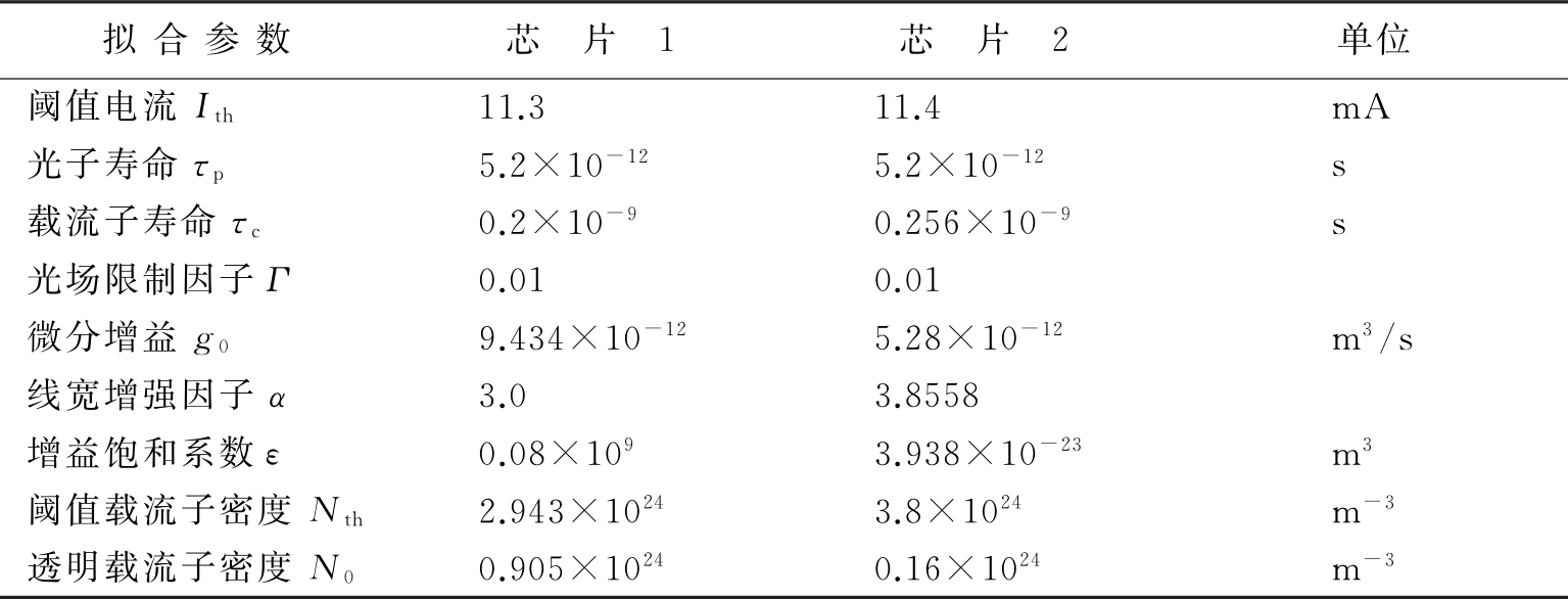 式中 f r 、 v o 、 f c 分别表示半导体激光器在阈值电流下的弛豫振荡频率、阻尼系数和啁啾频率。根据上述关系式,可以通过实验测得芯片稳态下的 P-I 特性曲线和频率响应曲线,间接通过线性方程解出半导体激光器芯片的内部参数值。