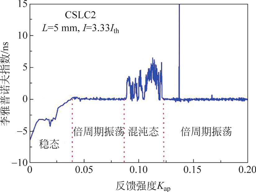 随着反馈腔长增加到5 mm,系统出现了新的非阻尼振荡。从图2-25(d)可以看到,当反馈强度小于0.03时,系统中振荡为阻尼振荡,系统仍然为稳态;随着反馈强度的增加,当反馈强度为0.03~0.07时,系统进入倍周期振荡状态;进一步增强反馈,当反馈强度为0.07~0.12,偏置电流为22~39 mA时,最大李雅普诺夫指数大于零,系统出现新的非阻尼振荡,系统出现了混沌态;进一步增强反馈,系统再一次进入倍周期振荡状态。从图中可以看出,外长腔为5 mm,反馈强度为0.07~0.12时,芯片2容易产生混沌激光,这和芯片1也不相同。