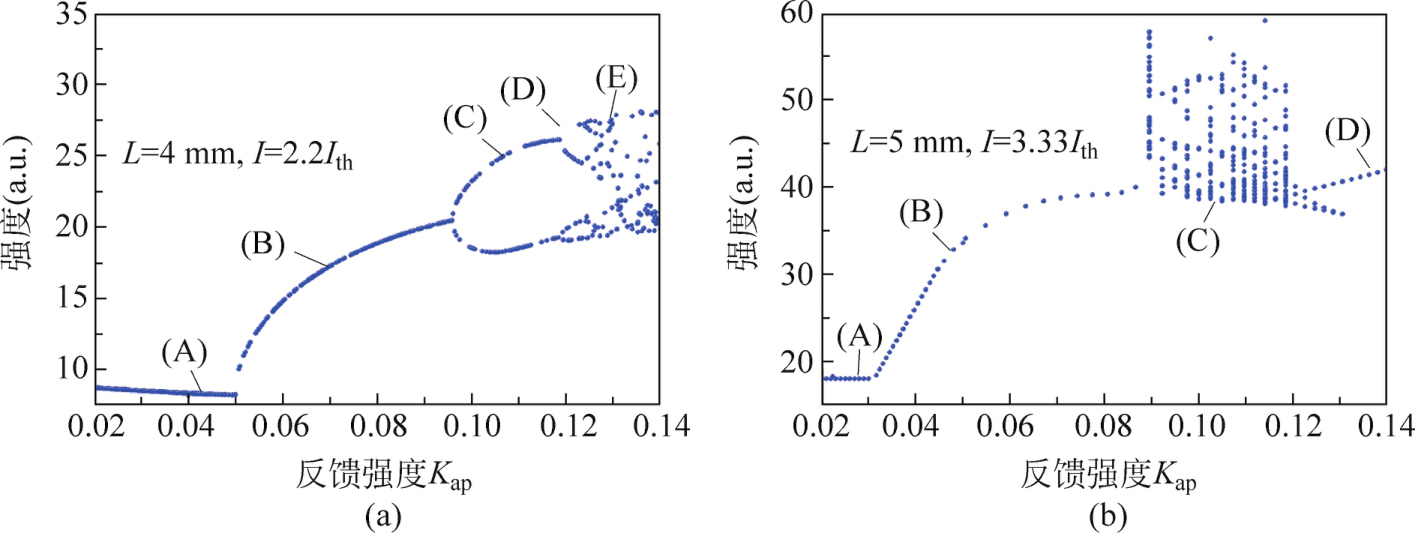 通过研究反馈强度从小到大变化时系统的振荡演变情况,可以得到系统进入混沌的路径,即观察系统的分岔图 [27] ,本节中分岔图是从电场强度的输出中抽取的极大值样本。图2-19(a)是混沌半导体激光器芯片1的分岔图,从图中可以看出随着反馈强度的增加,芯片1经历了稳态(A)、单倍周期振荡(B)、二倍周期振荡(C)、四倍周期振荡(D)、最终进入混沌态(E),从图中可以看出芯片1的混沌路径为倍周期路径;图2-19(b)是混沌半导体激光器芯片2的分岔图,从图中可以看出随着反馈强度的增加,芯片2经历了稳态(A)、单倍周期振荡(B)、混沌态(C)、倍周期振荡(D),从图中可以看出芯片2进入混沌的路径与混沌半导体激光器芯片1的混沌路径不同,不存在二倍周期和四倍周期振荡过程。