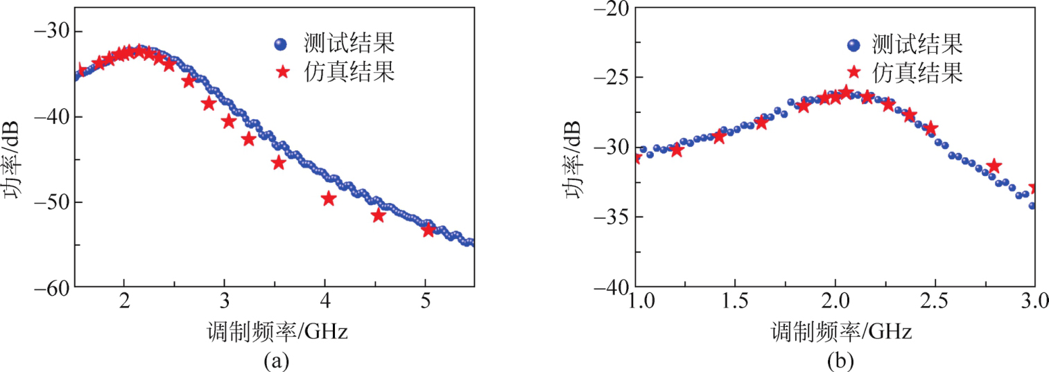 图2-14(a)是偏置电流分别为13 mA、16 mA、22 mA、28 mA时半导体激光器芯片1的频率响应曲线,曲线上的峰值是由于调制频率值接近半导体激光器芯片的弛豫振荡频率造成的。从图中可以看到,随着偏置电流的增大,芯片1的弛豫振荡频率也在增大。图2-14(b)是偏置电流分别为14 mA、18 mA、20 mA、22 mA时半导体激光器芯片2的频率响应曲线。对比芯片1和芯片2的频率响应曲线,3 dB带宽较窄(3 dB带宽是指激光器的频率响应度相对于激光器低频响应度变化达到3 dB的频率点),半导体激光器芯片1的高频率响应曲线更平坦、更光滑,意味着半导体激光器芯片1的高频响应性能更好。