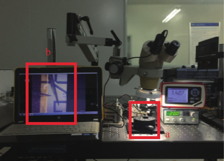 图2-9为半导体激光器测量 P-I 特性曲线的实验装置图,a部分为自由移动平台,用来固定并移动芯片;b部分为芯片的图像,通过探针加载偏置电流。图2-9的右半部分分别为低噪声直流源和光功率计,分别用来给芯片提供直流电流和记录芯片的输出功率。